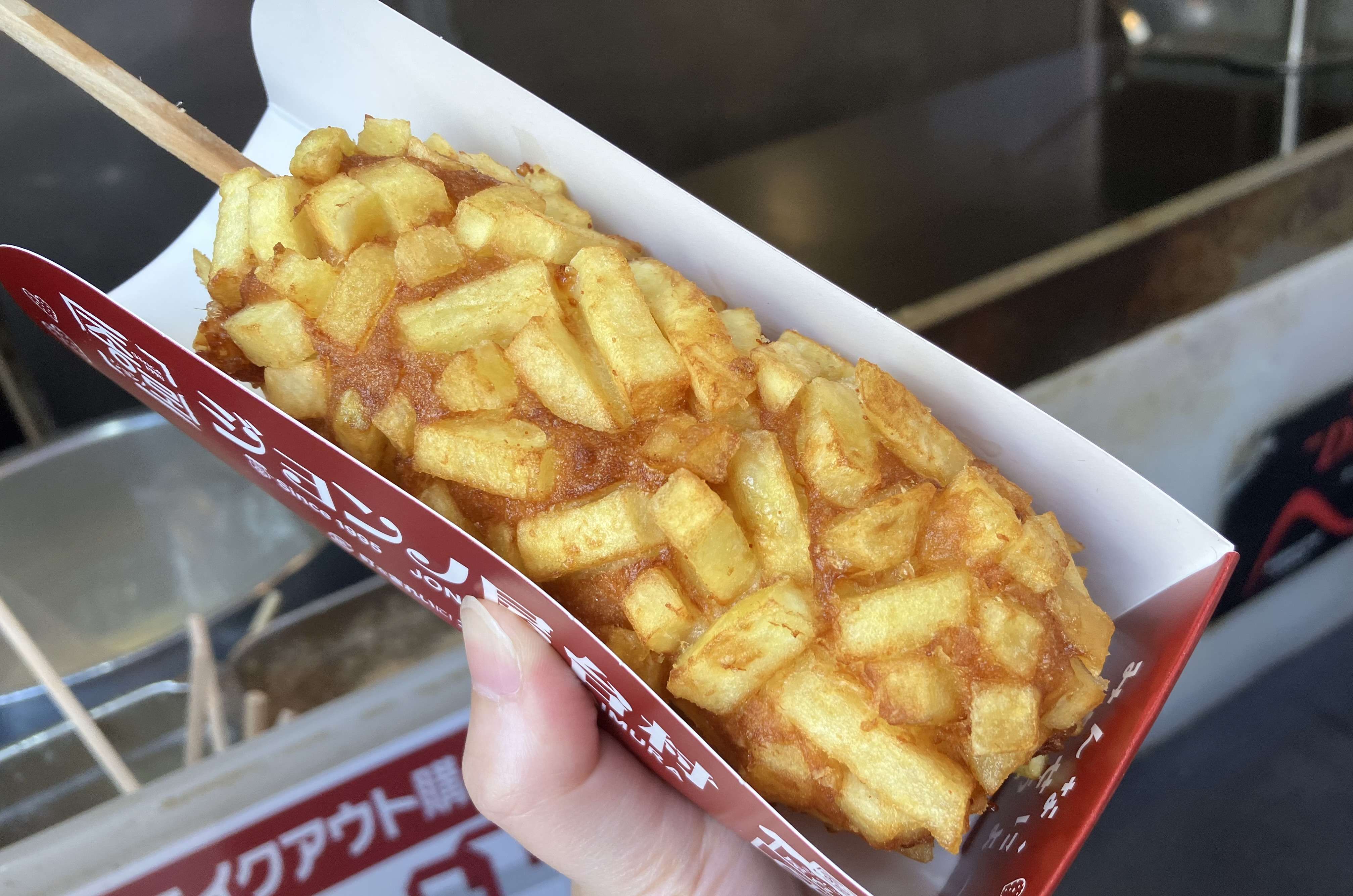 ジョンノ屋台村で人気NO.1のポテトモッツァレラチーズお米ハットグを食べました。いつも大人気なお店で、並んでいることが多いです。中のチーズと外側のポテトのさくさく感が美味しく絶品でした。ソウル市場で出来立てのキンパも購入できて嬉しかったです。