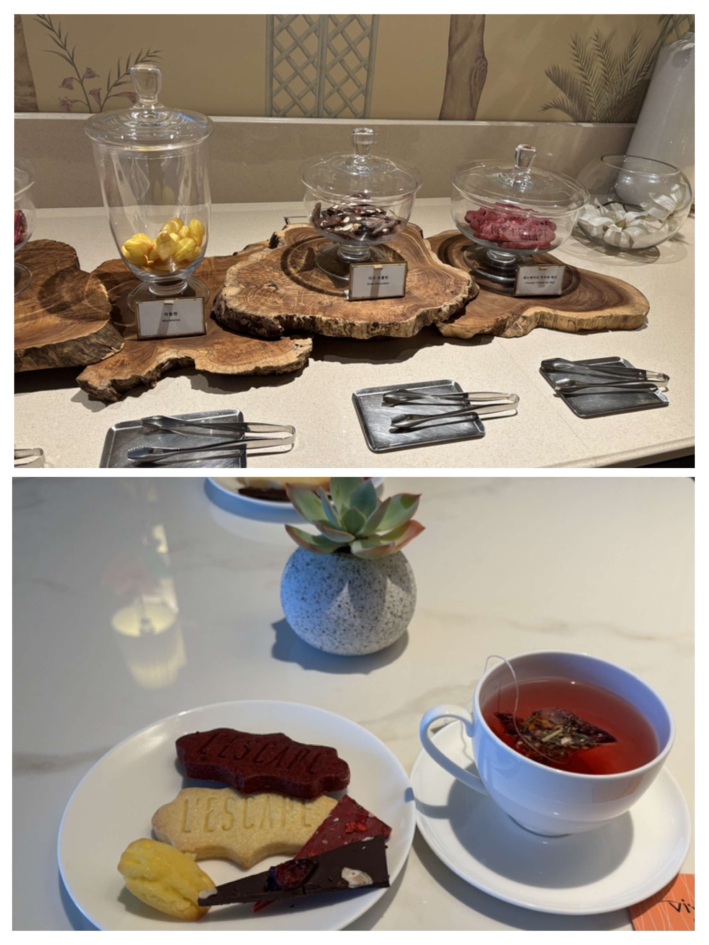 ティータイムもいろんなティーがあった。ホテル名が記されたクッキーも気分があがる。