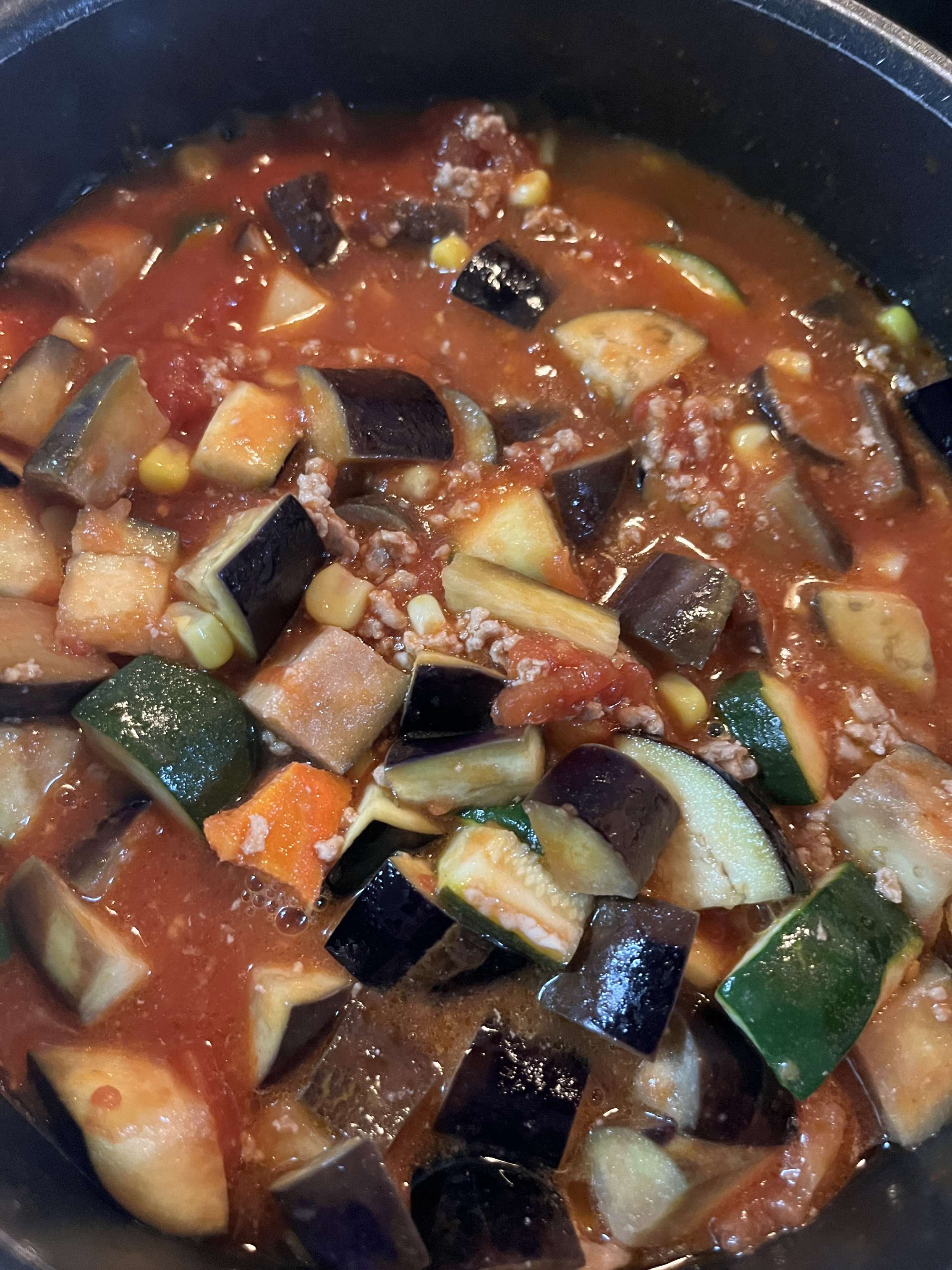 畑の茄子が沢山ありドライカレーにしました。具材は他にズッキーニとコーン缶。トマト缶とカレールーで美味しくなりましま。