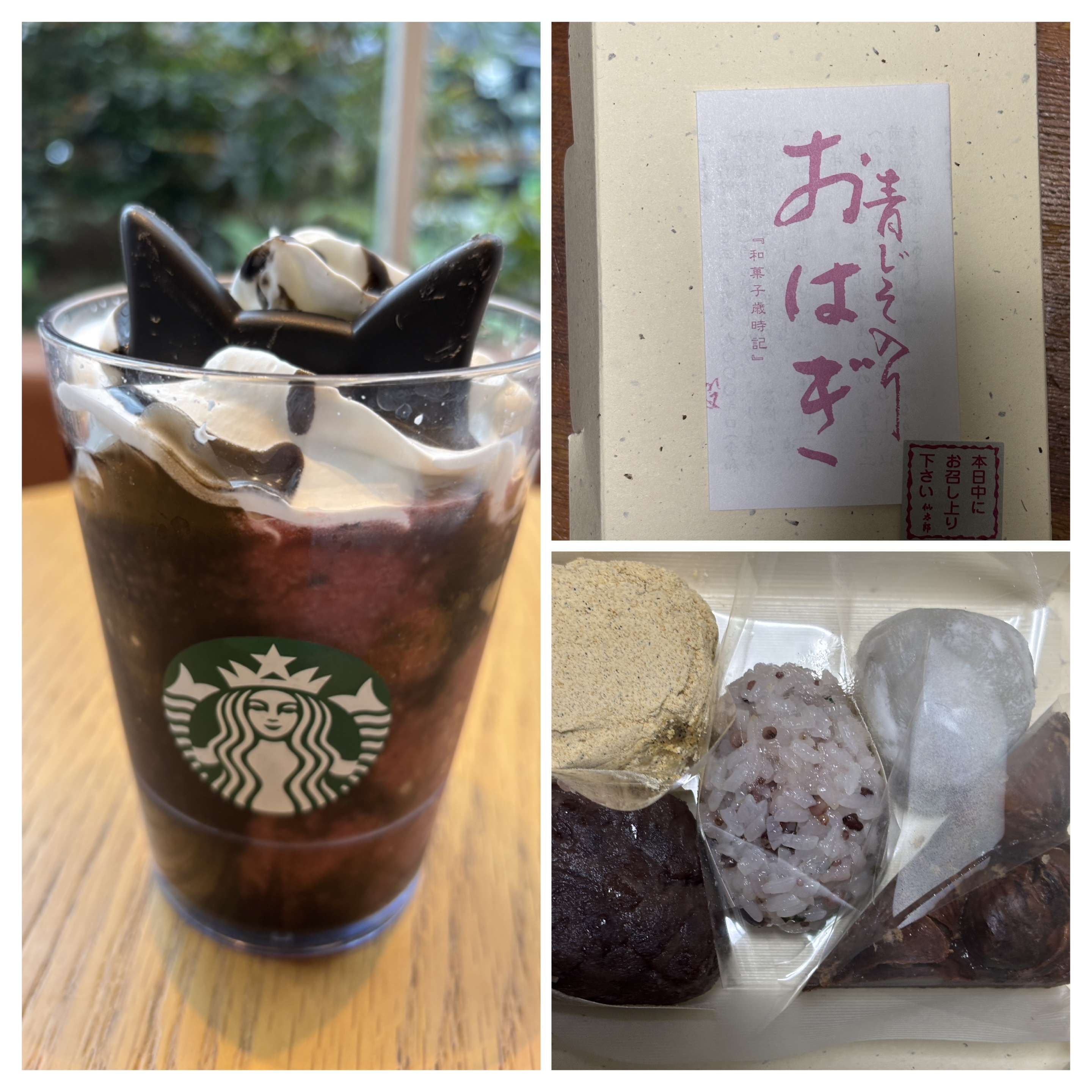 授業後に伊勢丹に寄り、行くたびに行列のお店「仙太郎」に並んだ。初めて買ったおはぎたち。私は栗入り大福半分と、渋栗蒸し半分いただいた。大福の中に栗が一個入っていて甘すぎず美味しかった。渋栗蒸しはビジュアルも良いしおいしかった。おはぎは青じそ入りだそうだが、そうとは知らずに家族に食べてもらったので残念だった。また買わなければ。