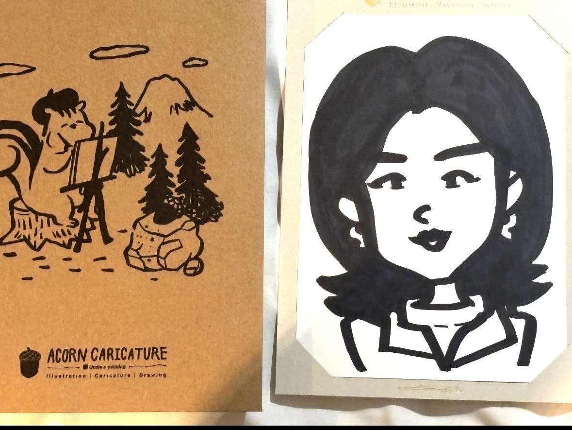 同じお店「トトリカリカチュア(どんぐり似顔絵) 」で描いてもらった。漫画風の似顔絵を数分(3分くらい?)で描いてもらう。