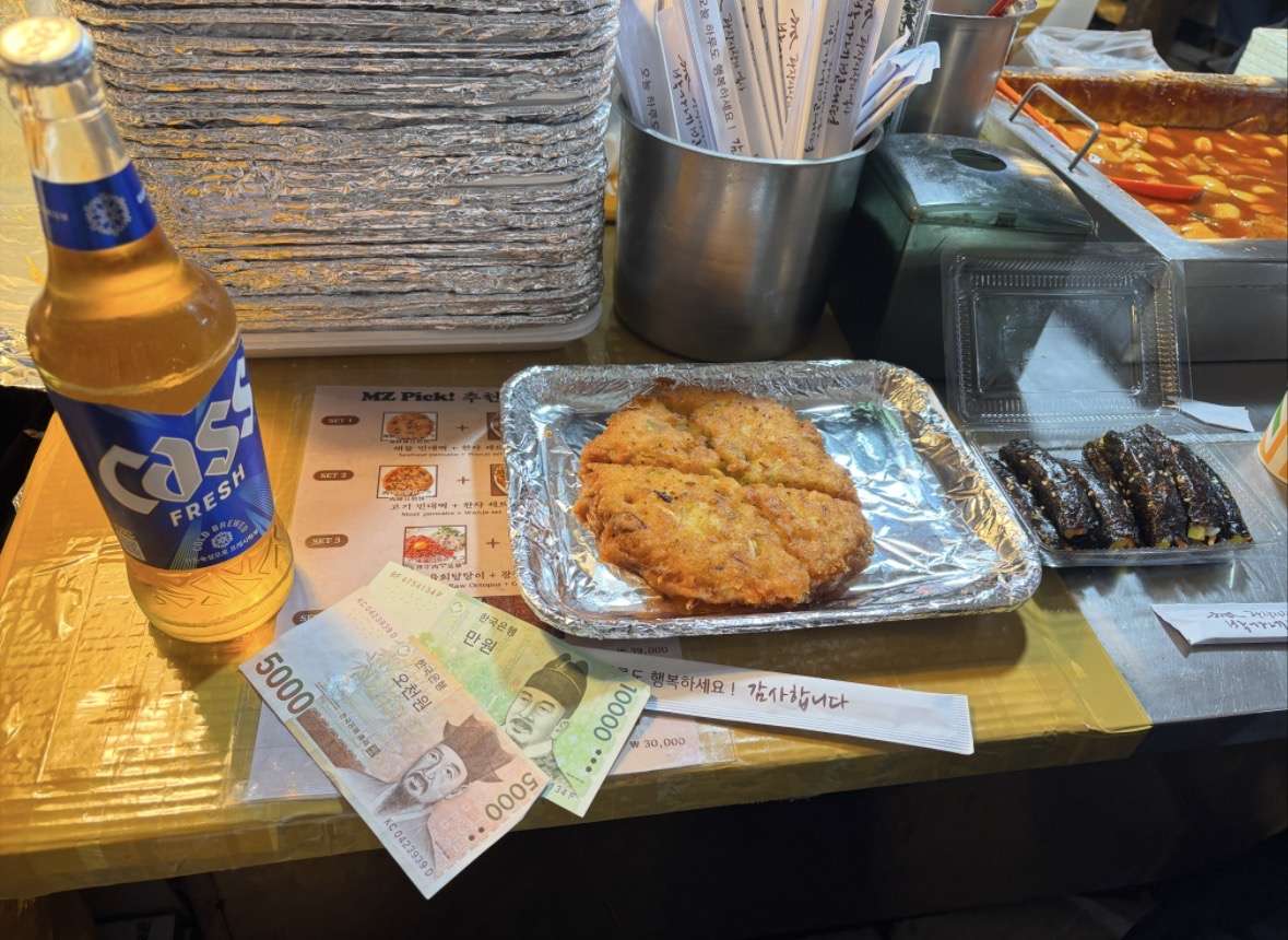 食べたものは 緑豆チヂミとミニキンパと瓶ビール