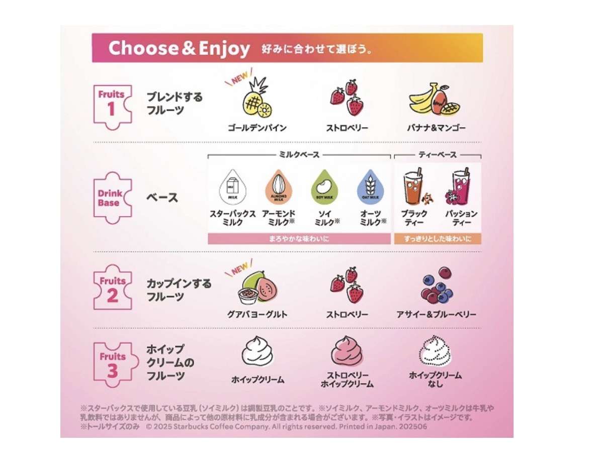 スターバックスでブレンドするフルーツ、カップインするフルーツ、ホイップクリームのフルーツの「3つの選べる」フルーツで作るマイフルーツフラペチーノ