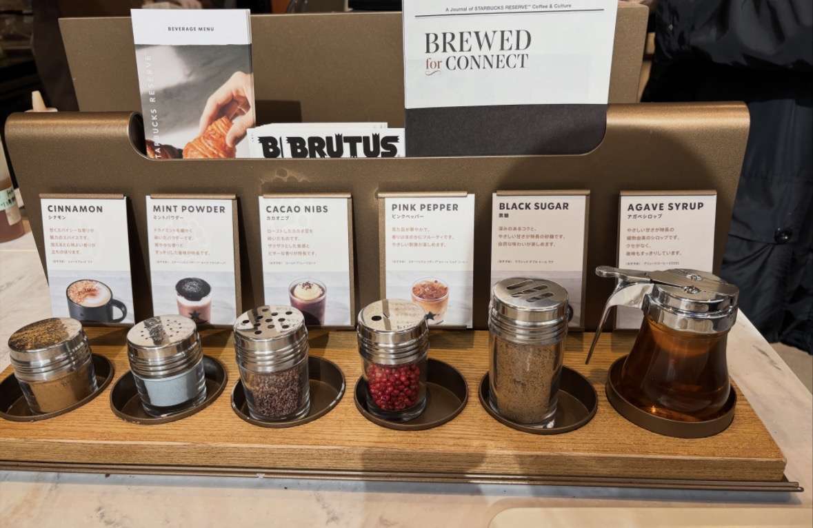 自分でシナモンなどふりかけるコーナーもあり、ショートブレッドラテに合う物を聞いたら、シナモンとザクザク食感が楽しめるカカオニブもお勧めとのこと。両方かけてみた。