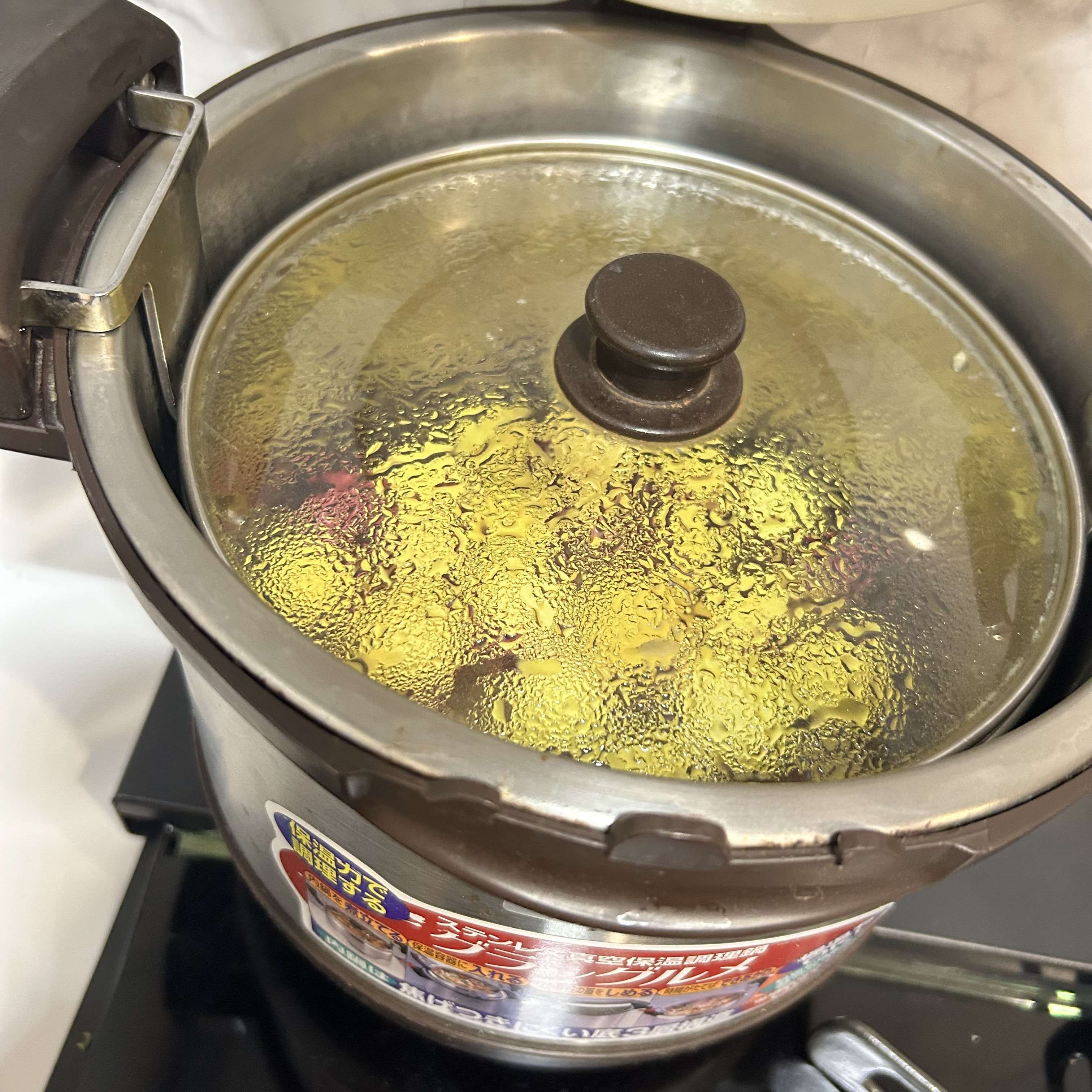 その後、外の器に入れて保温調理します。時間が経つとジワジワ火が通って柔らかくなります。