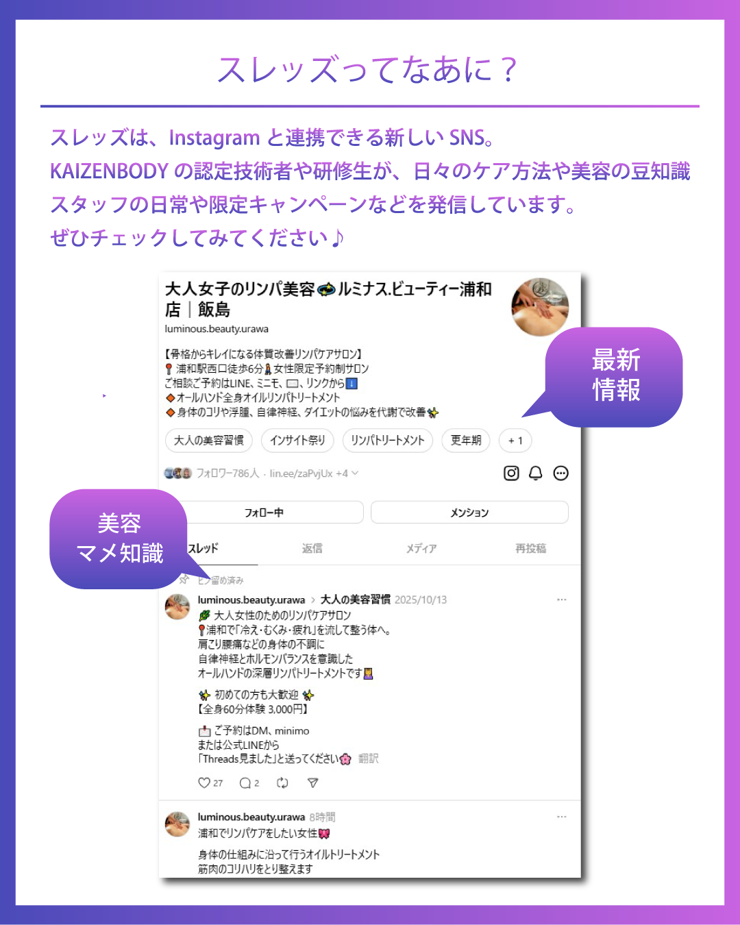 KAIZENBODYでは、X・Instagram・YouTube、そしてここ最近注目度が急上昇している「スレッズ」を活用しています。
