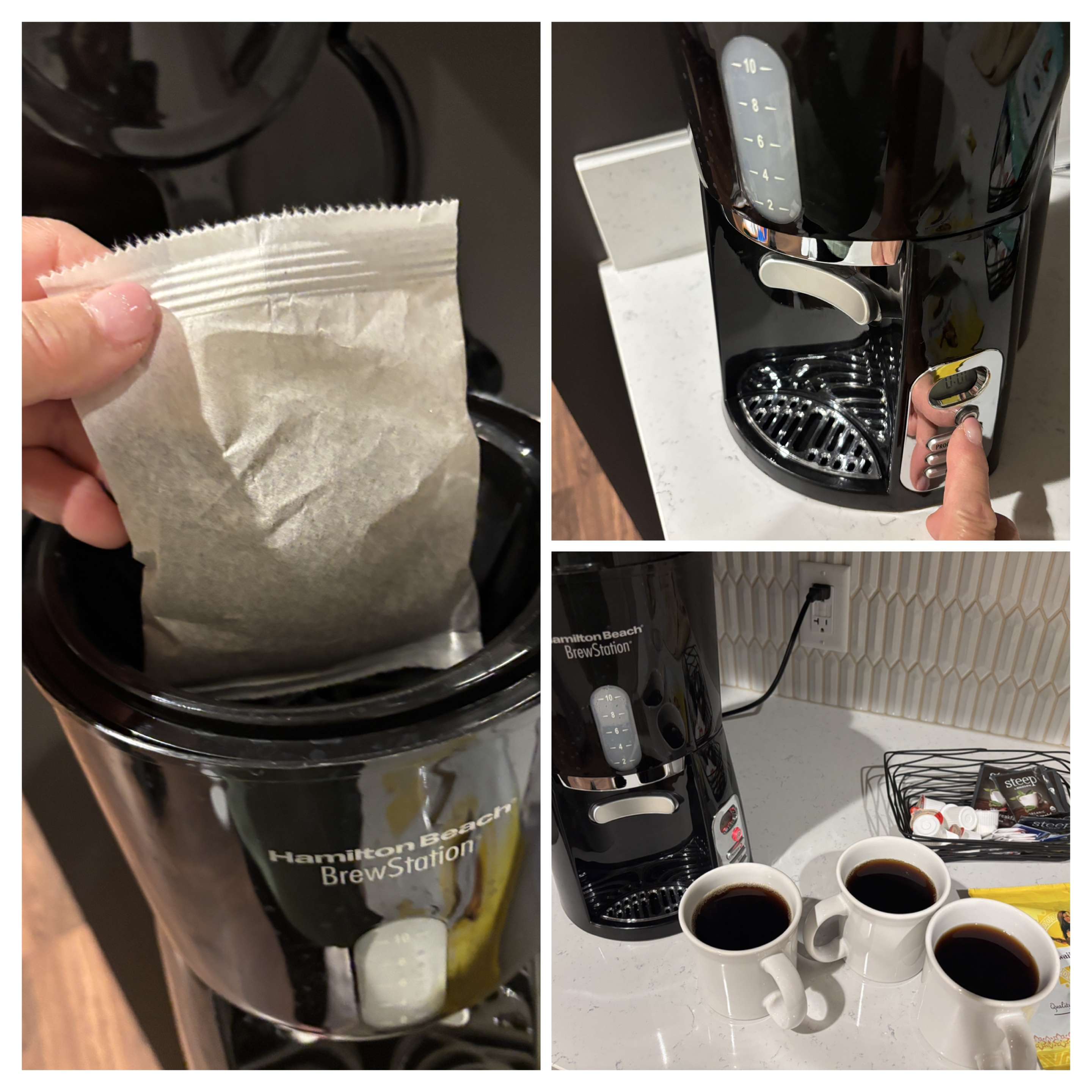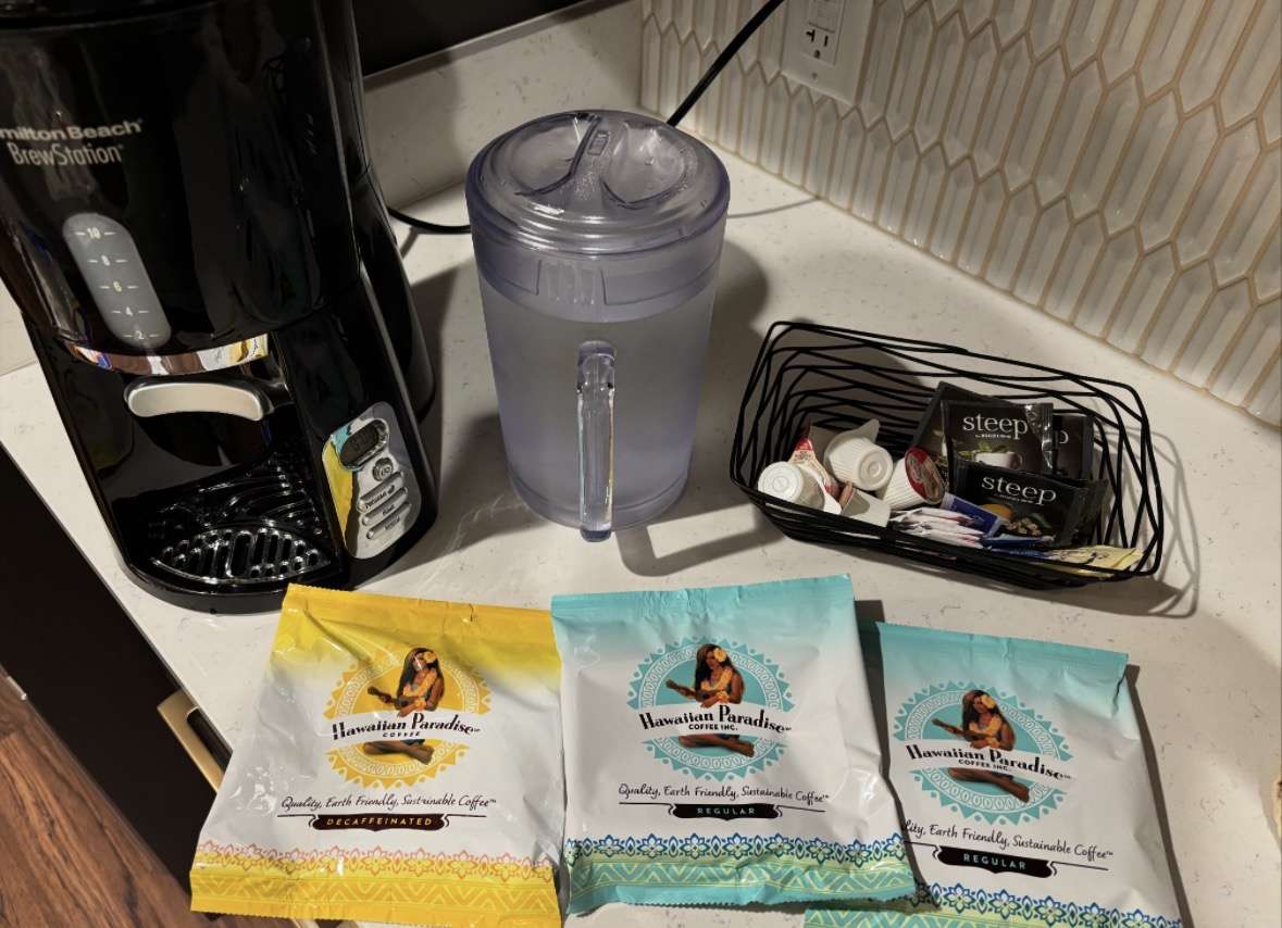 デカフェ1袋とレギュラー2袋が毎日補充されている。コーヒーマシンを使って淹れるのだが1袋で1ポット分できる。