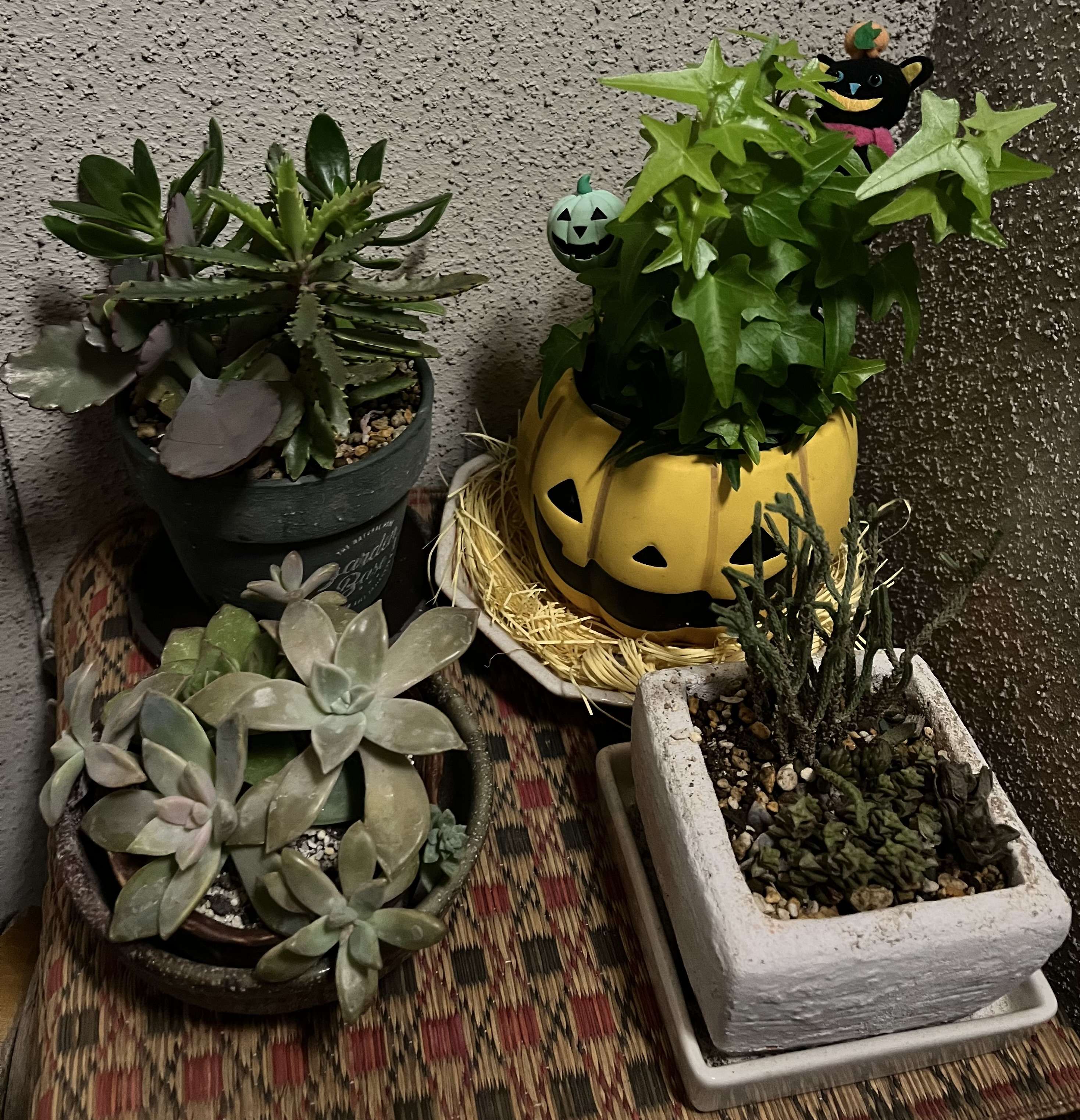 玄関外に〔雨が当たらない〕靴箱を置きました。その上に植物達。