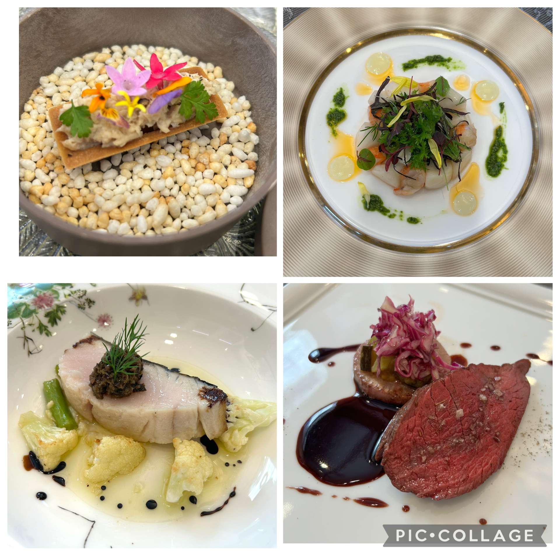 前菜、スープ、メインは魚と肉で、シェフがお料理の説明をされて、こだわりを感じました。