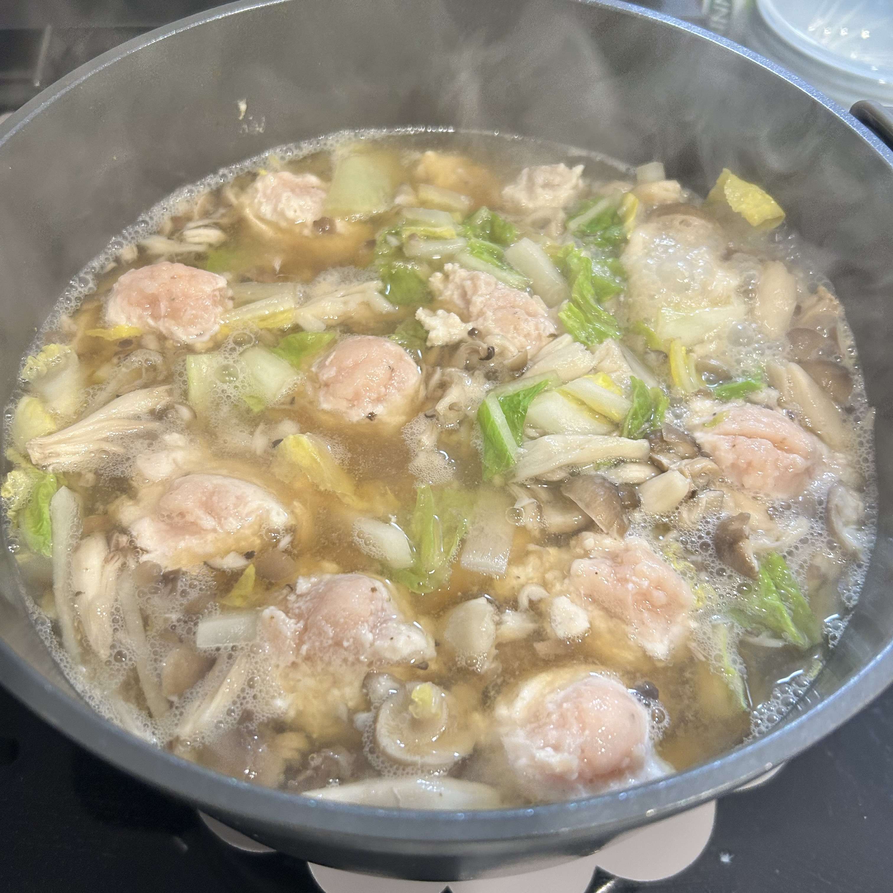 白菜、大根、きのこと、鶏ミンチのつくねです。