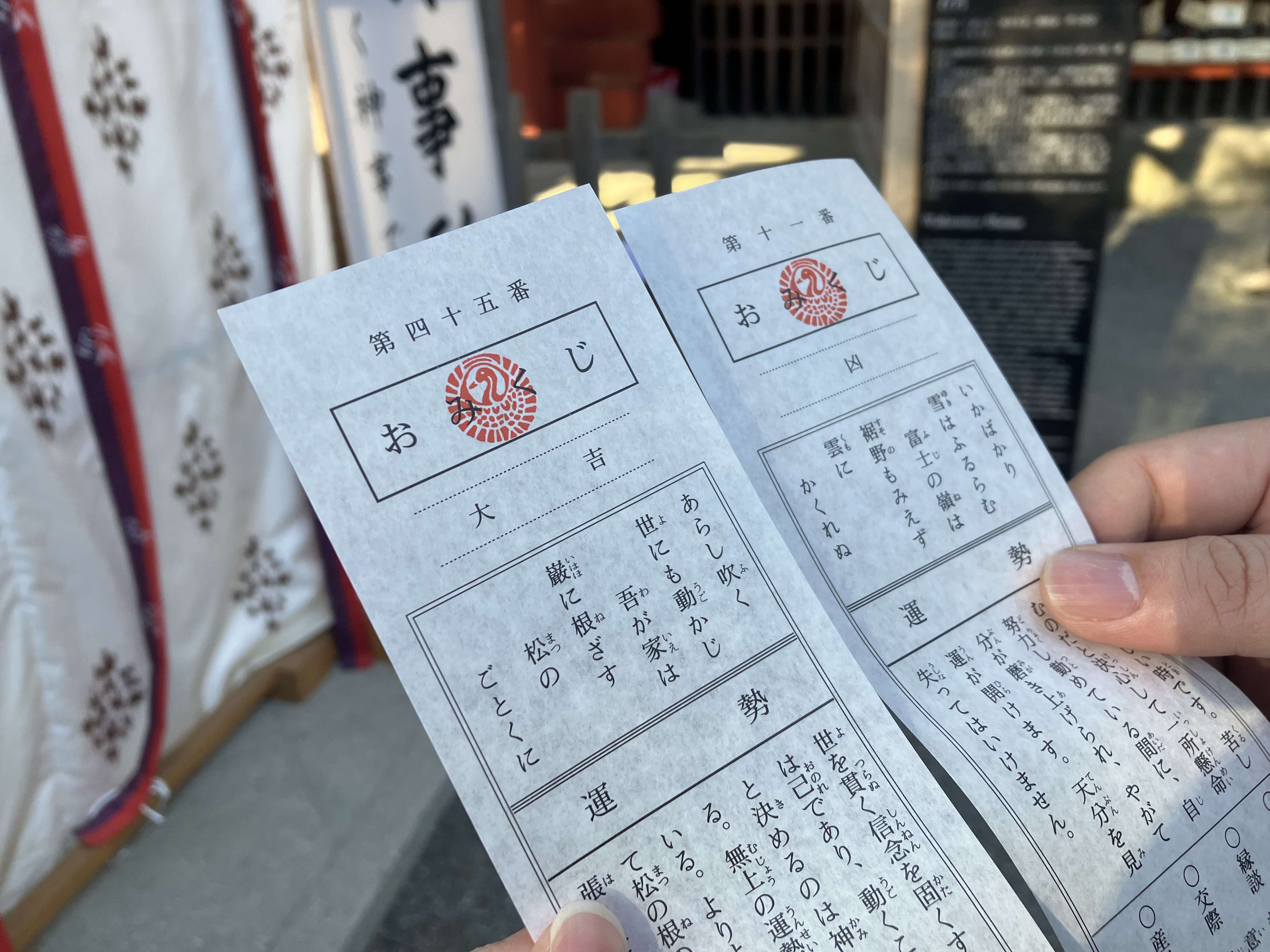 鶴岡八幡宮へ初詣に行きました。おみくじを引くと昨年に続き今回も大吉でした☺️夫は凶でしたが、前向きなことがたくさん書いてあったので良い年になりそうです。