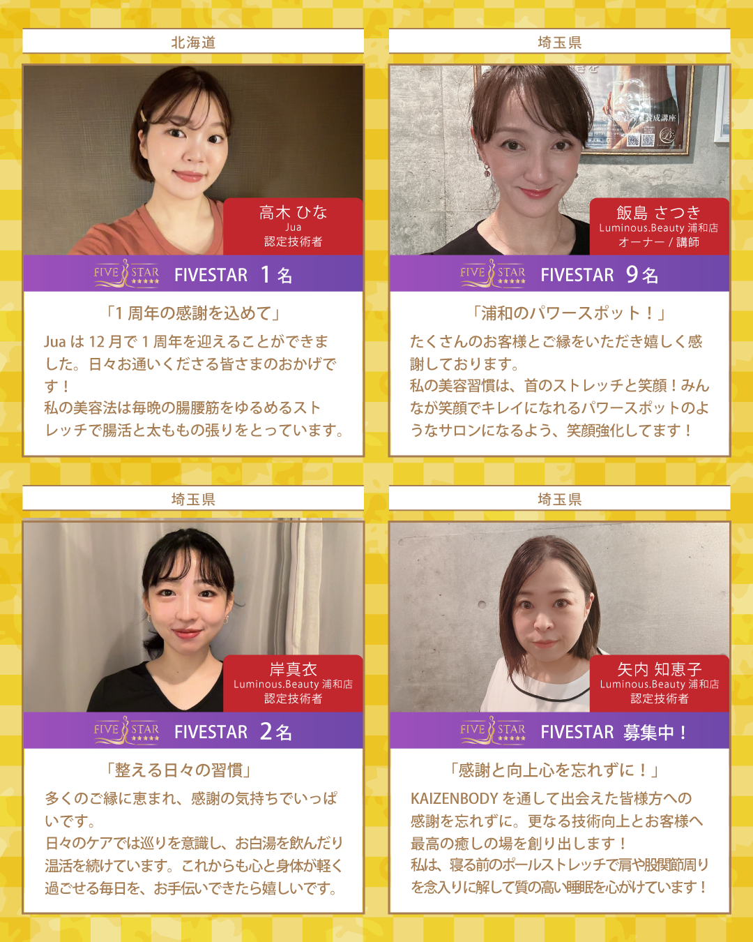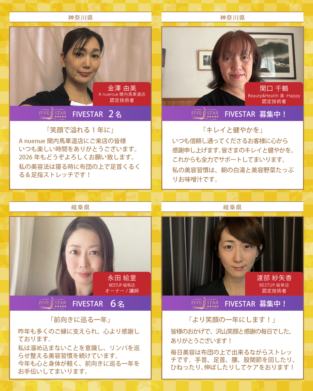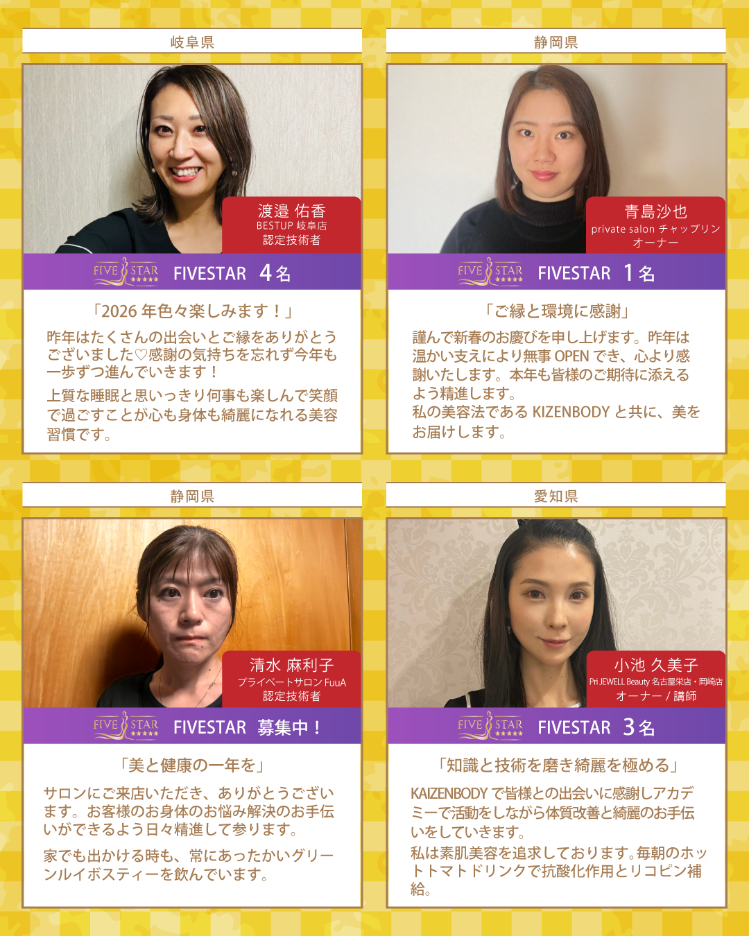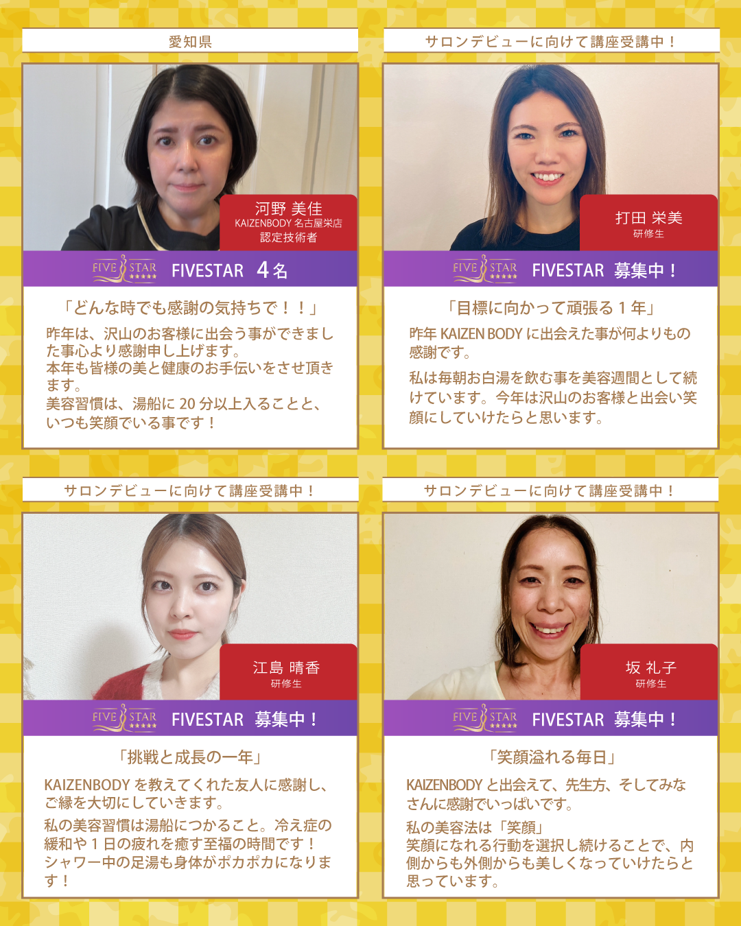 新年最初のBcoinTown Newsでは、お客様の生涯の美容のパートナーを目指す総勢37名のKAIZENBODY認定技術者より、新年のご挨拶と美容家の女性たちが実践しているオススメの美容習慣をお届けいたします。