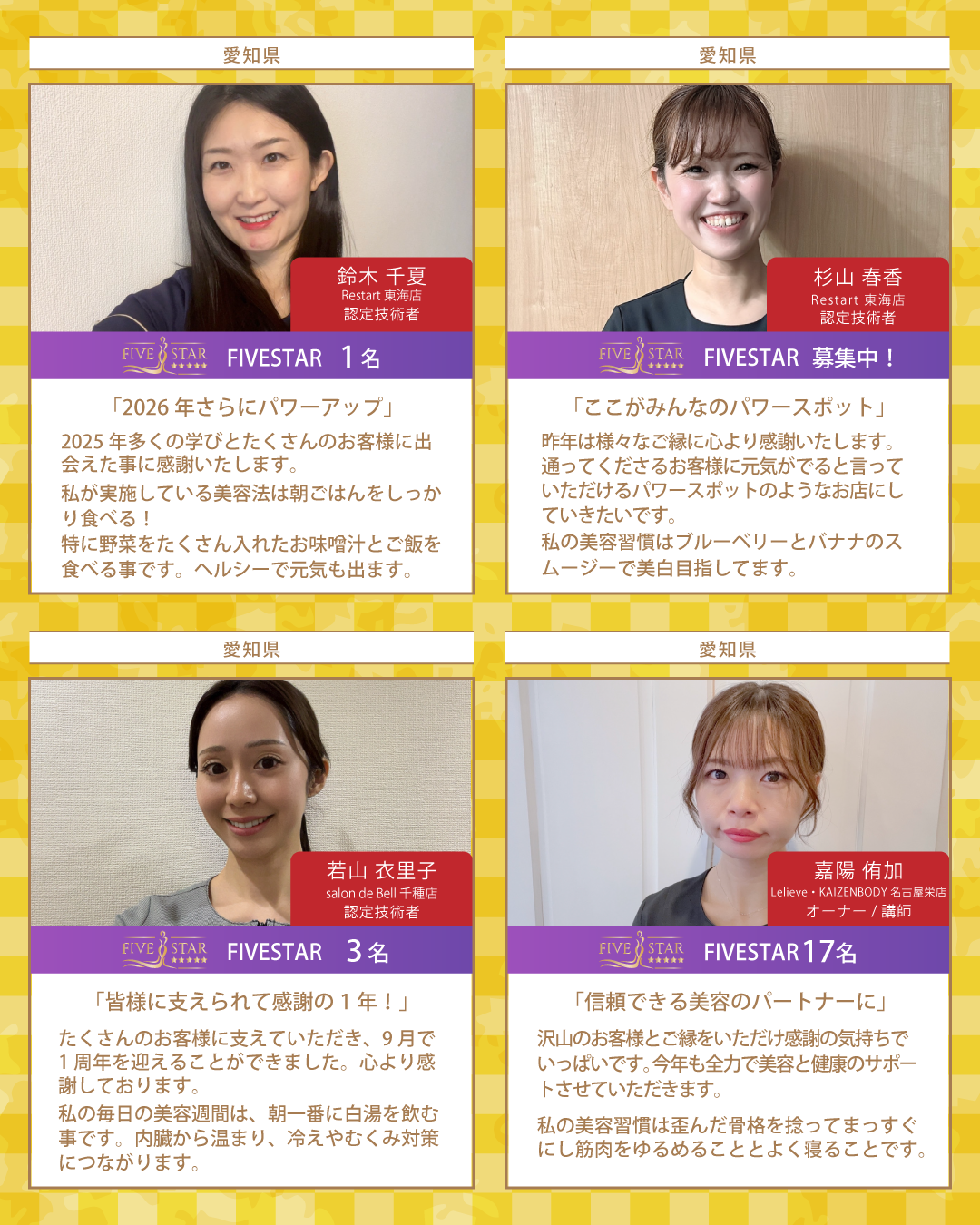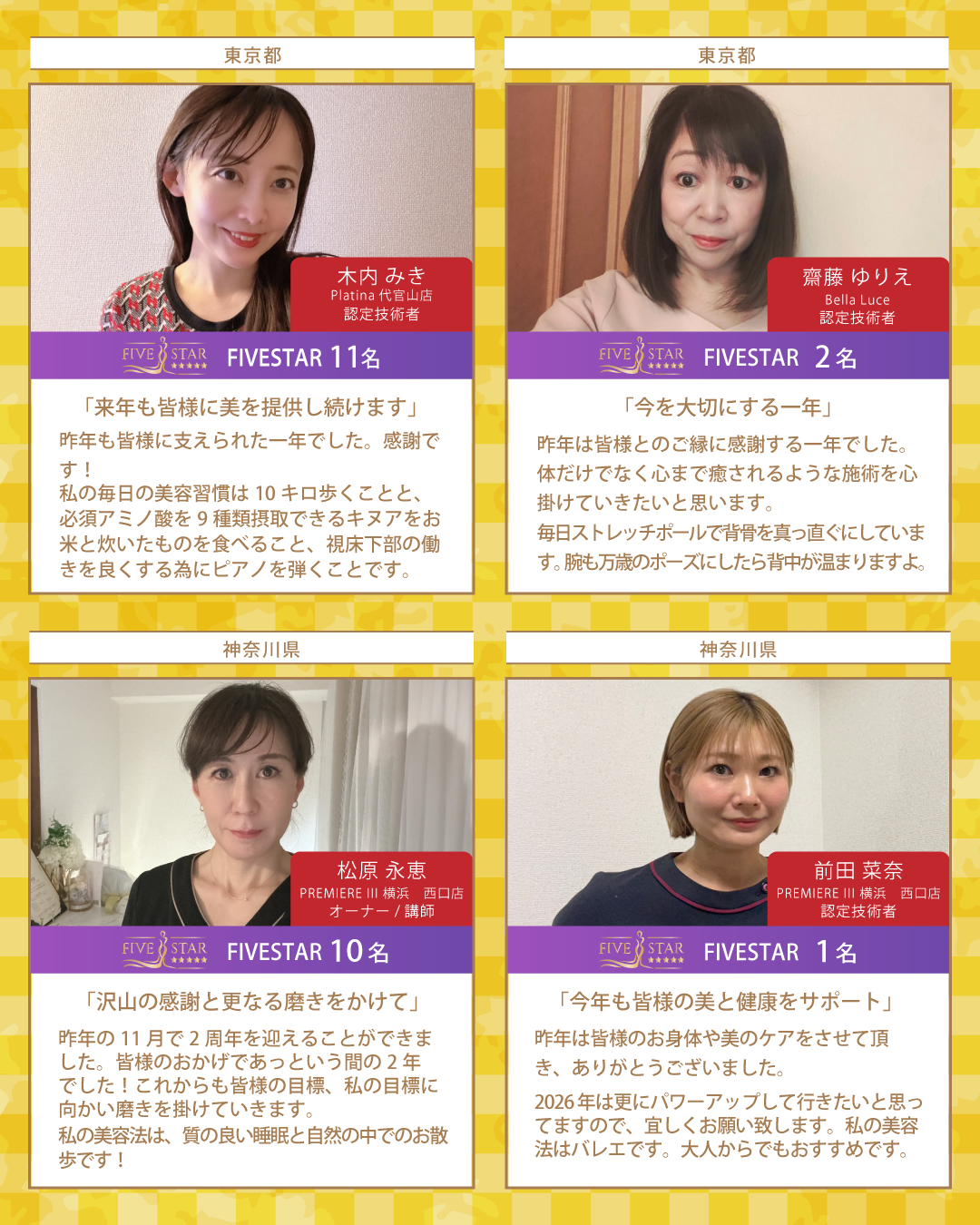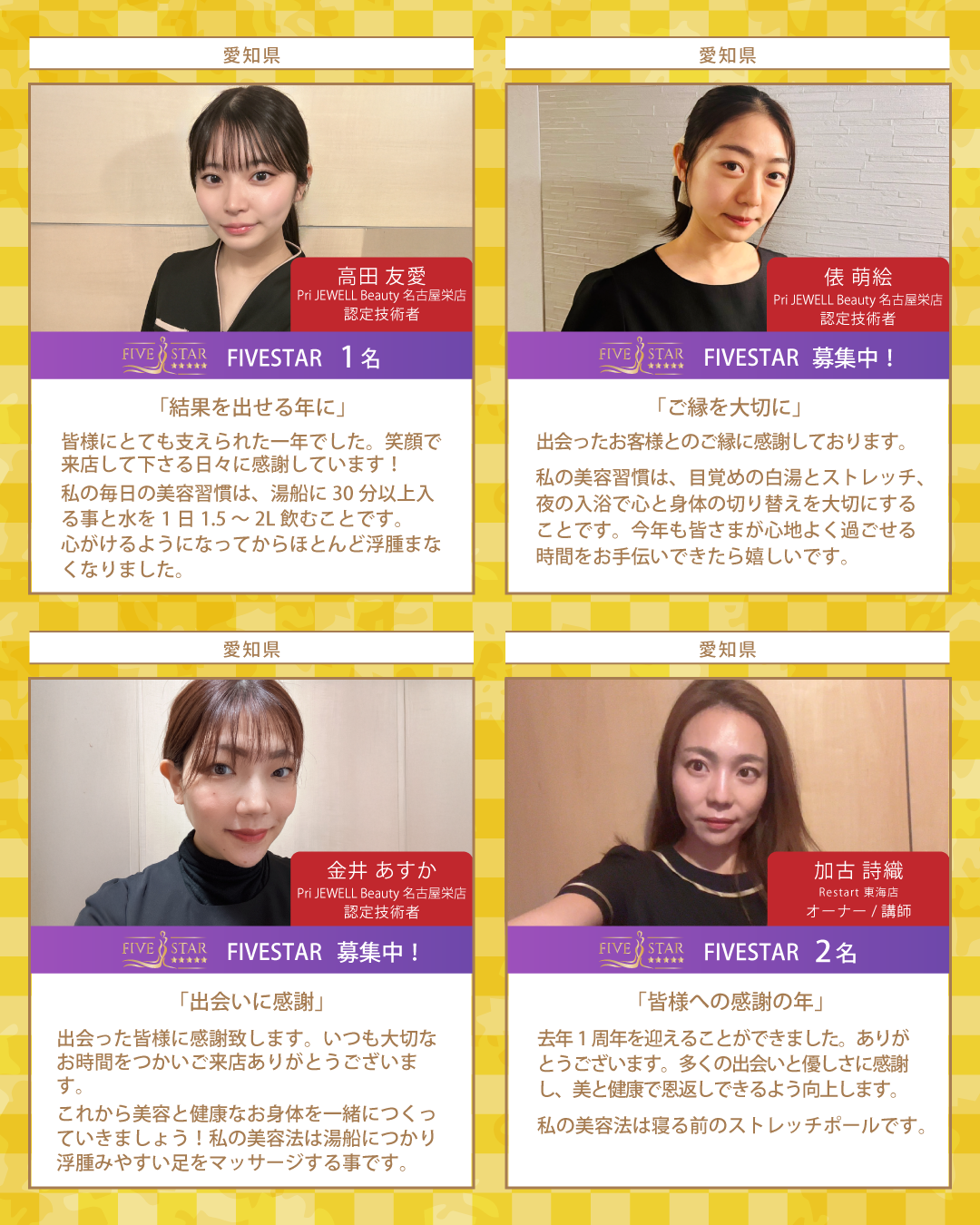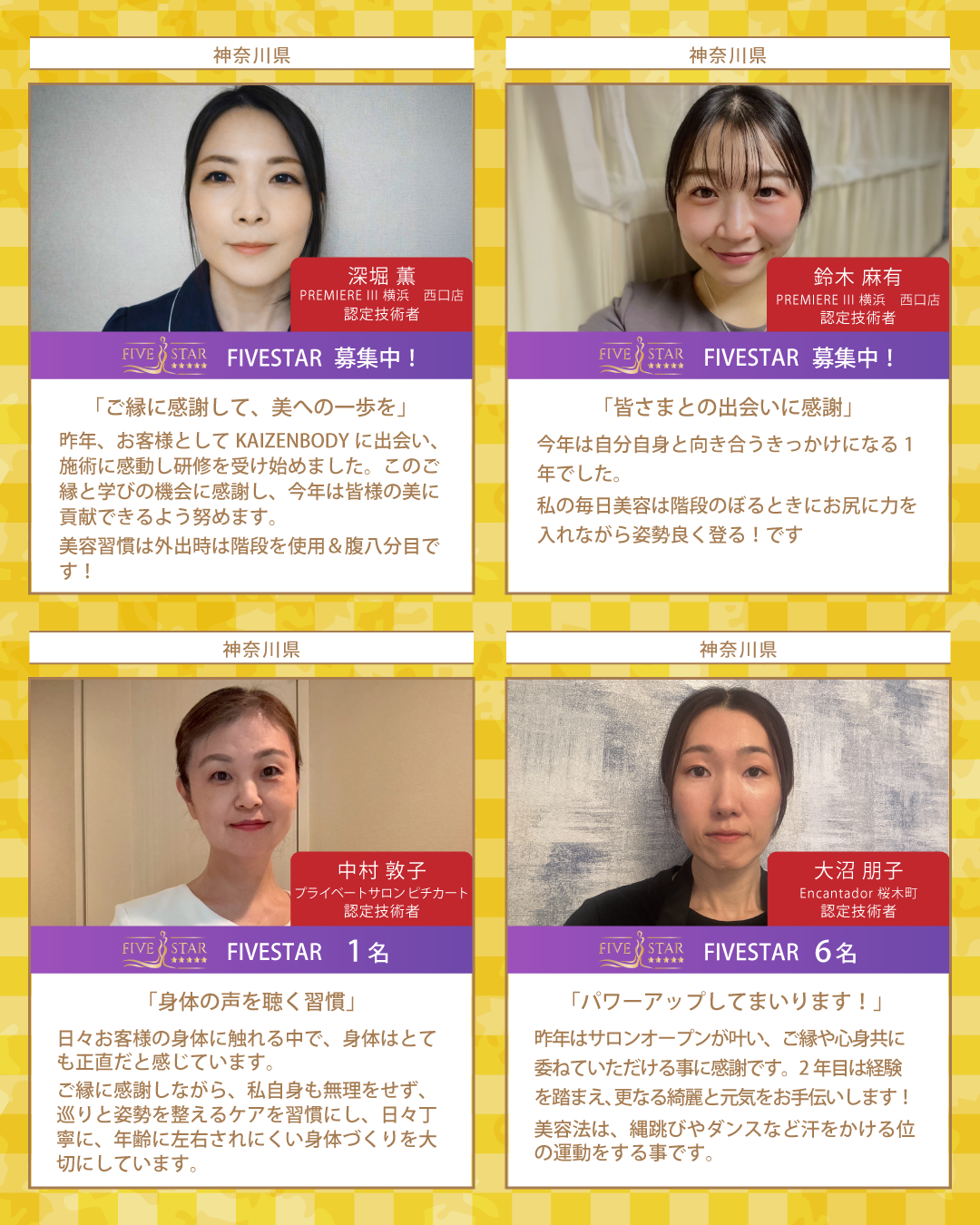 新年最初のBcoinTown Newsでは、お客様の生涯の美容のパートナーを目指す総勢37名のKAIZENBODY認定技術者より、新年のご挨拶と美容家の女性たちが実践しているオススメの美容習慣をお届けいたします。