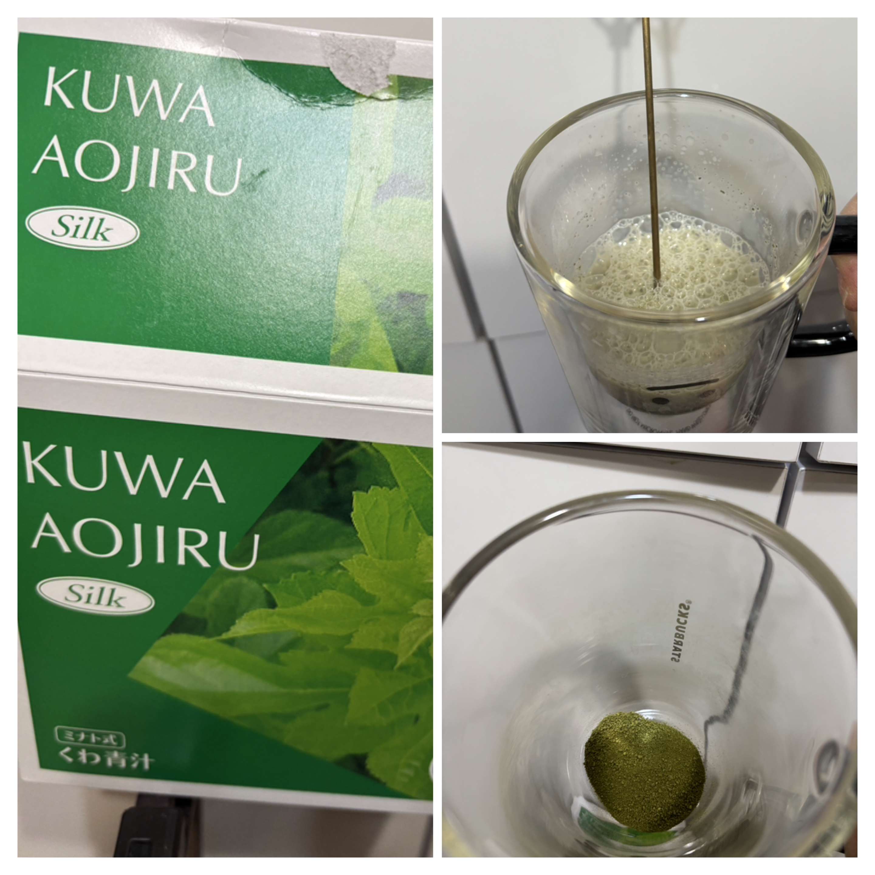 早速 豆乳に入れて飲んでみた。豆乳の味が強くてあまり桑の葉茶という感じはなく、最後に抹茶と青汁(いかにも健康そうだが、苦くは無い)の後味があった。