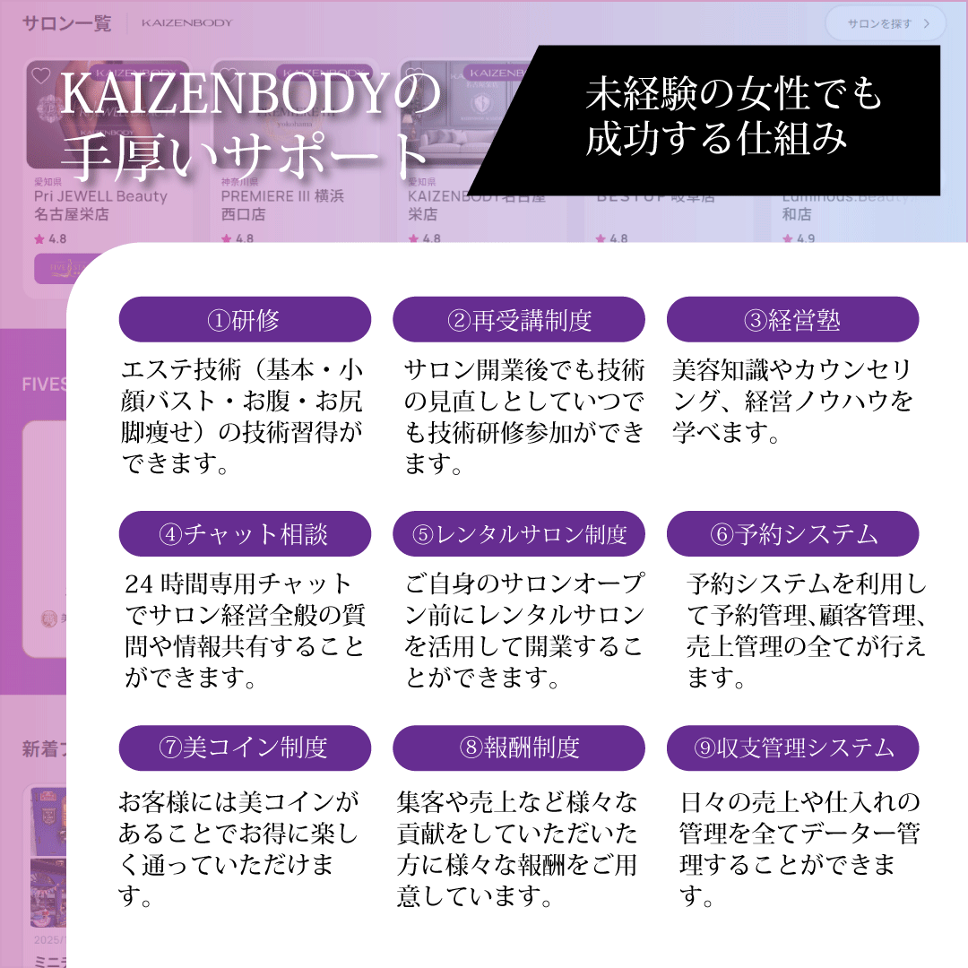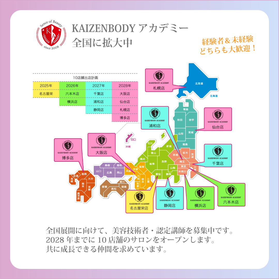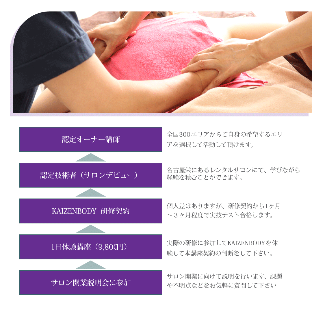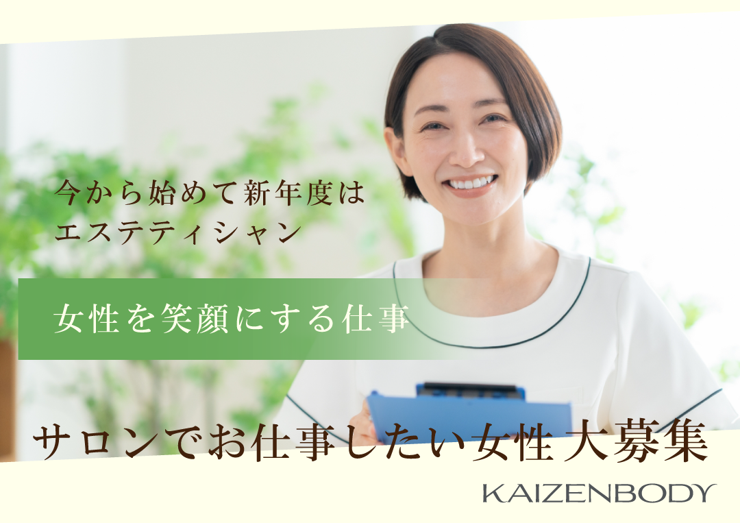 特別な経験がなくても、年齢や住む場所に関係なく始められるのが、KAIZENBODYのエステの学び方です。