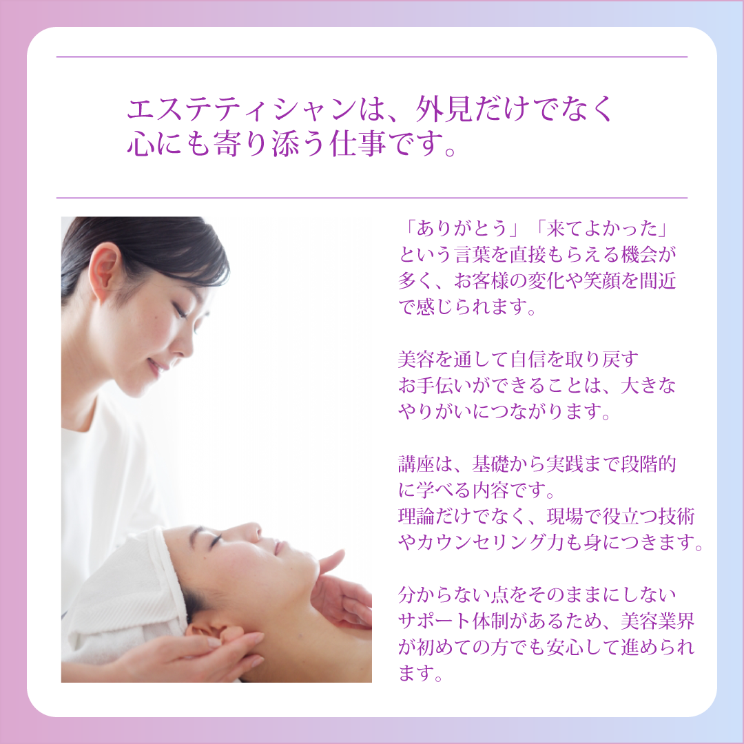 そんな想いから、エステティシャンという道に興味を持つ方が増えています。