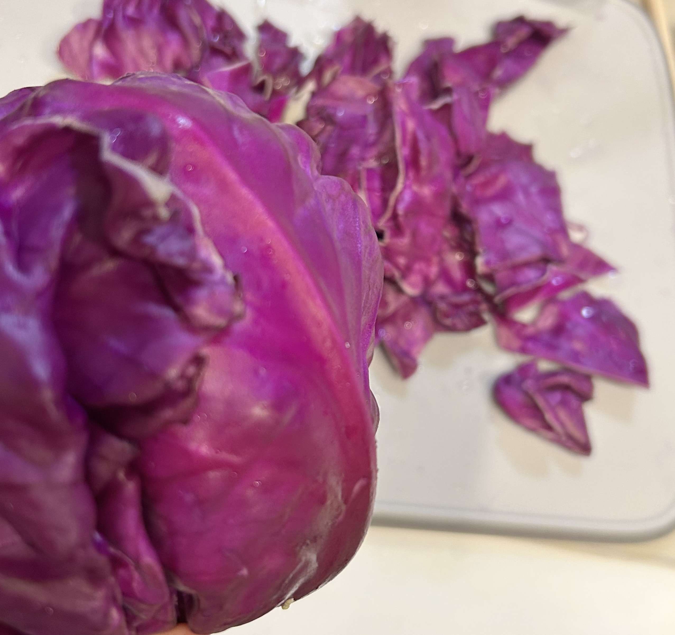 普通のキャベツより少し厚めで硬めで、炒めても色は変わらず、紫をキープしてます。