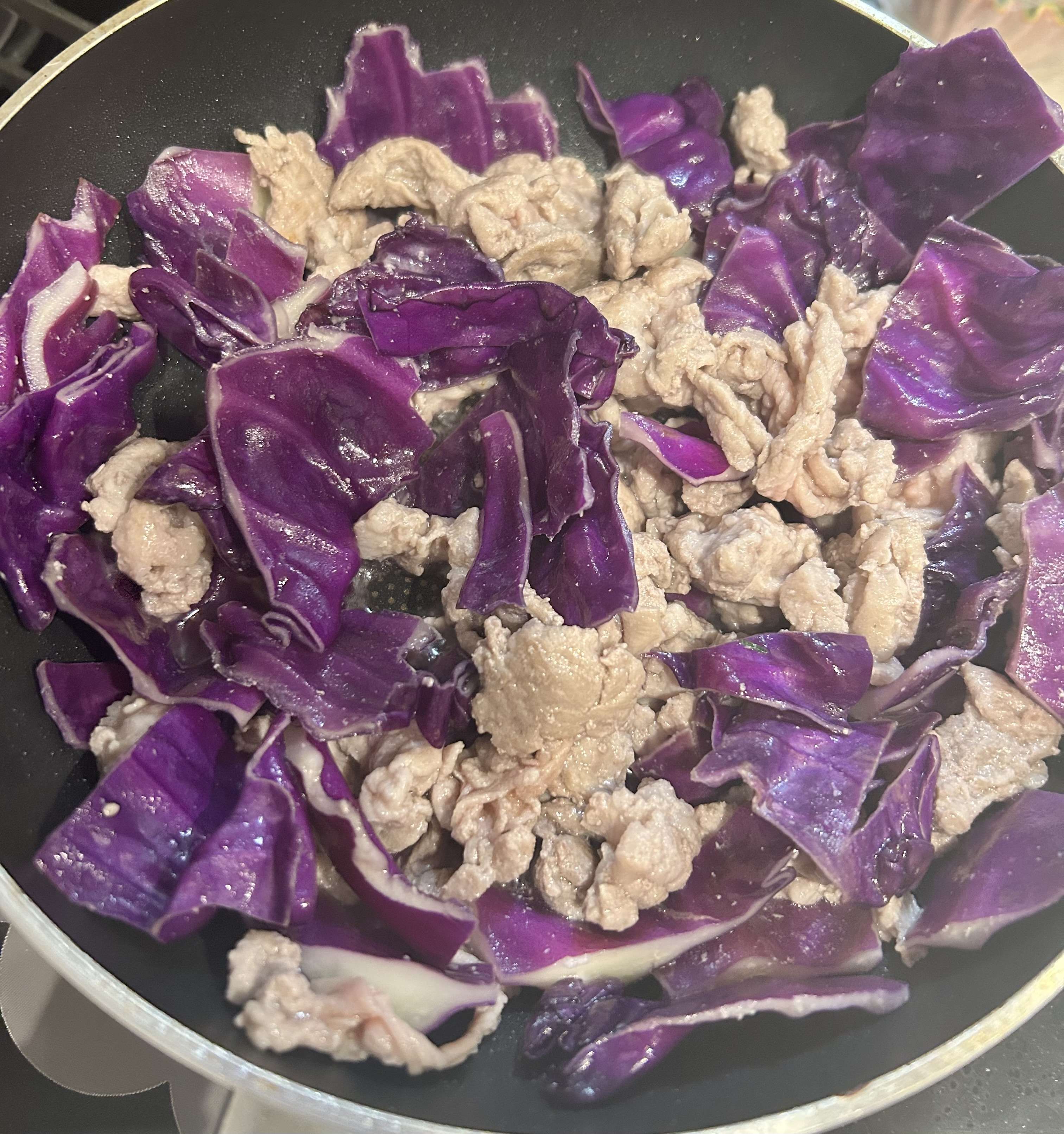 姉からもらった紫キャベツと豚肉の炒め物を作りました。