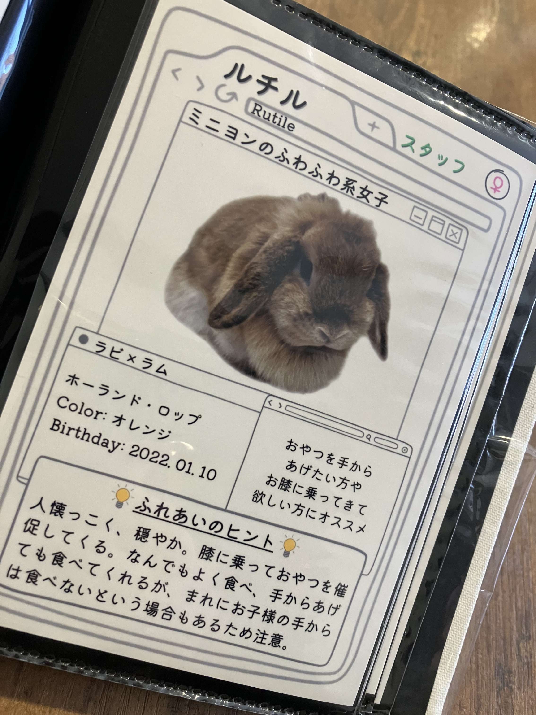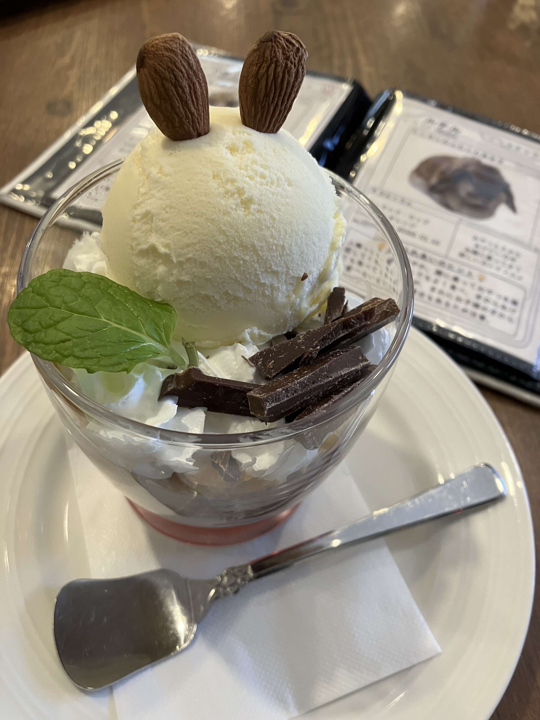 うさぎのチョコレートパフェは見た目もとても可愛いです。今回のふれあいは誕生日の日にちが近かったルチルちゃんにしました。膝の上に乗ってくれたりして癒されました。毛並みもふわふわで幸せな時間でした。