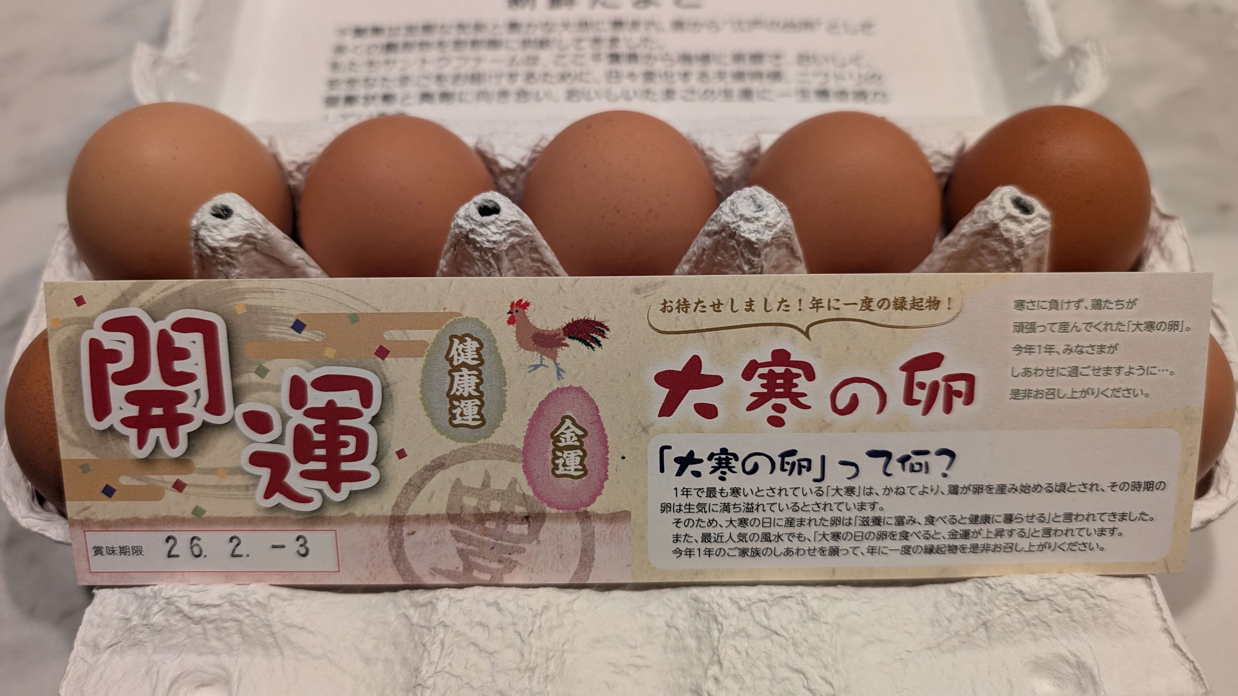 最も寒い時期、大寒の日に産まれたたまご「大寒のたまご」は、栄養豊富で無病息災・健康増進の願いを込め、また風水では金運が上がるともいわれています。