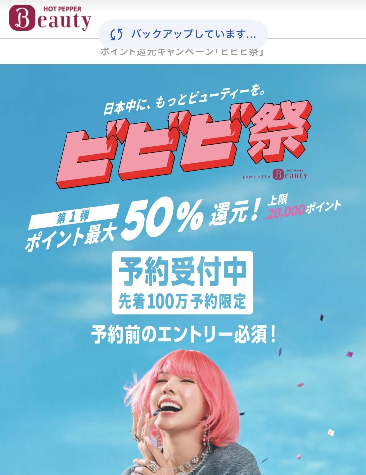 ビビビ祭は、美容院とそれ以外(ネイル、まつ毛、リラク、エステ)をそれぞれ一回以上予約して行くと料金の50%もポイントバックしてくれる。(ただし上限は1回あたり10,000ポイント。美容院とそれ以外で合計20,000ポイントまでもらうことができる)これはお得だ。