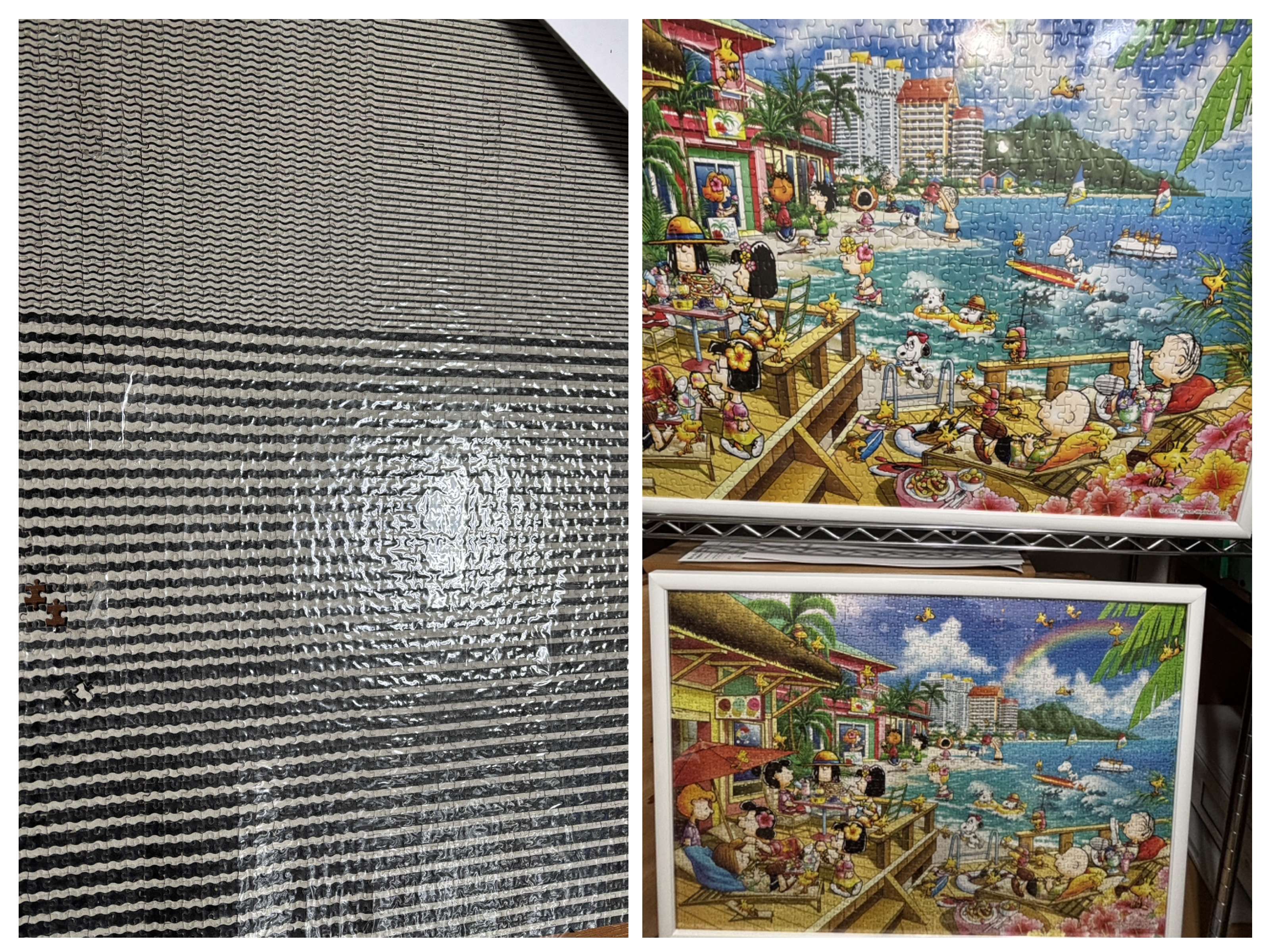 最初この絵柄が気に入りスーパースモールピース2000を買ってもらったのだか、難しすぎて直ぐに断念。代わりに同じ絵柄のレギュラーピース1000(写真右上)を買ってもらった。年末にやることがなくなり、放置していたスーパースモールピース2000を作り始めた。海と空と藁葺き屋根が大変でそれぞれ最後の1ピースが入らない。実は裏にヒントの直線、波線があるので、最後にひっくり返して作ってみた。直線はわかりやすいが、波線(太い波線)がわかりにくくて大変だった。何とか誤魔化して?完成させ糊付けまでしたが、