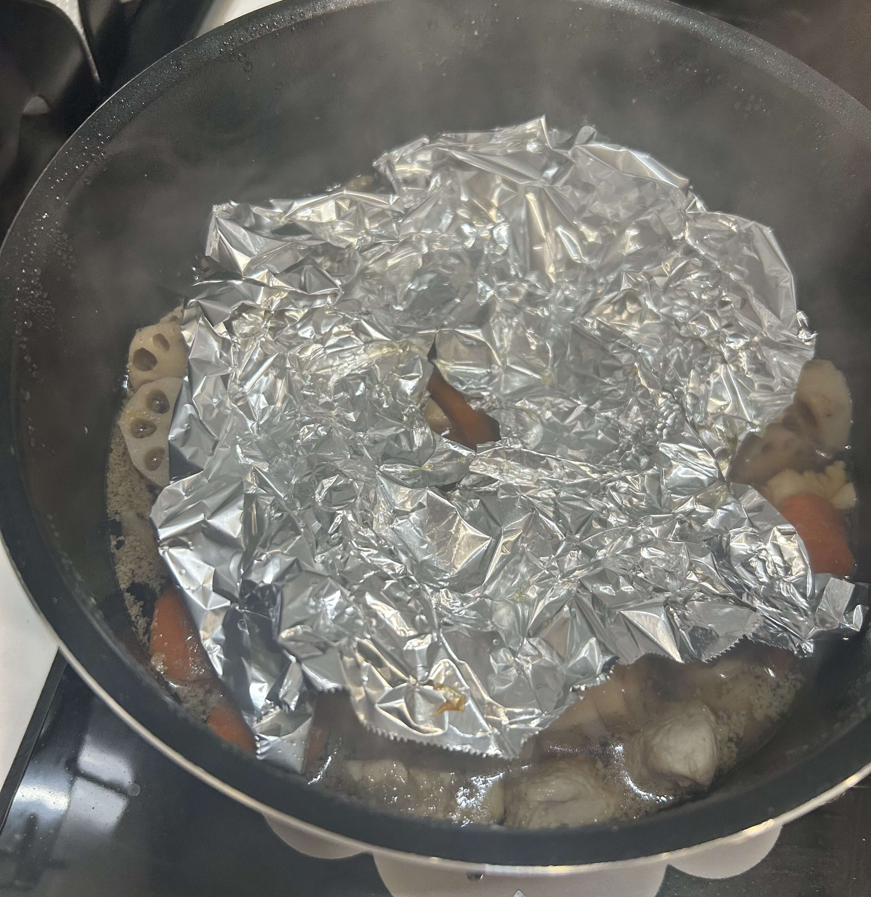味付けはレシピを見て測り、あとは味を見ながら調節し、落とし蓋を買ってないのでアルミホイルで代用し、美味しくできました。