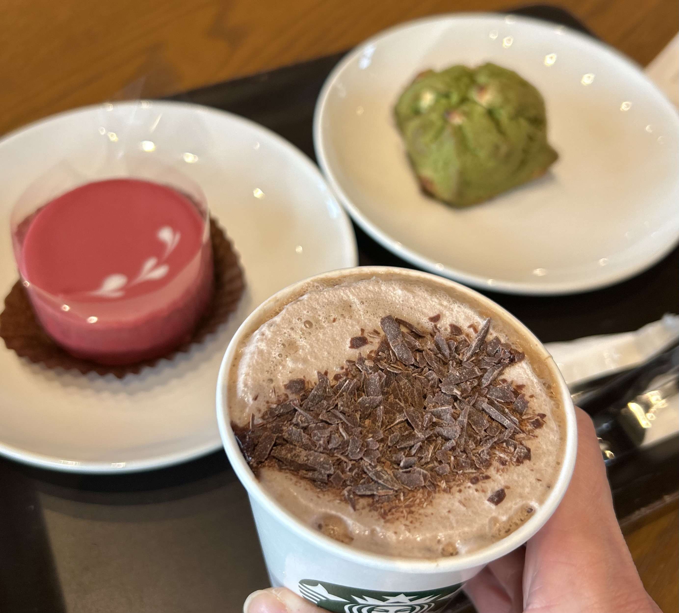ドリンクのお供は、色が可愛くて気になったルビーチョコレートケーキと、以前食べて美味しかった抹茶&ホワイトチョコスコーン。