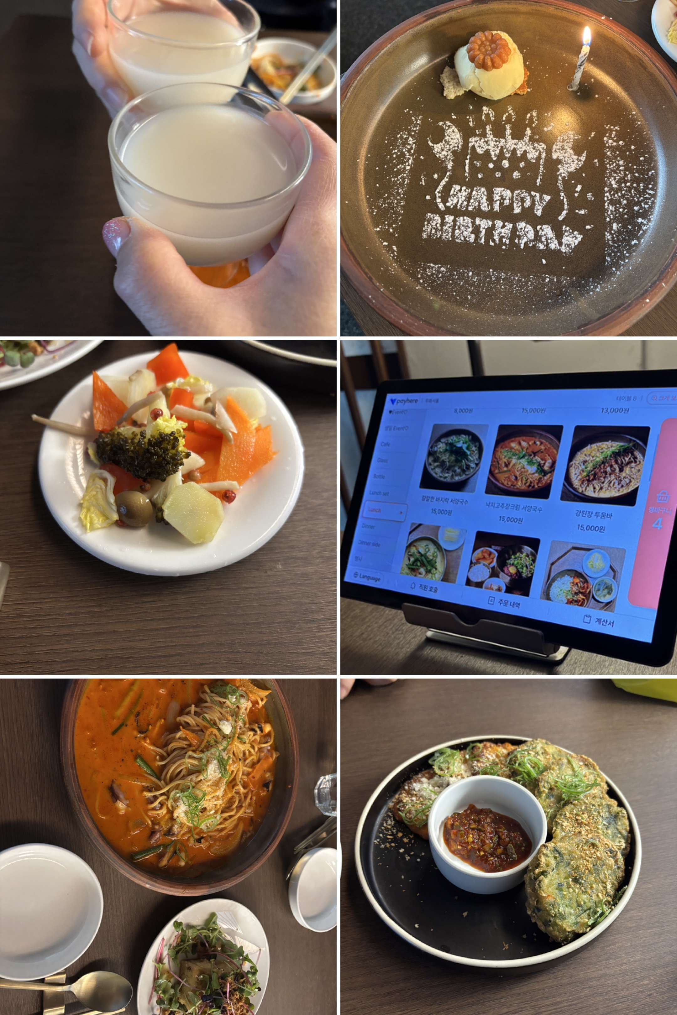 蝋燭が立てられたプレートにはハッピーバースデイの文字とアイスクリームの上に韓国らしい薬菓が載っていた。友人の誕生日なのに私がいただいちゃった。夕方から仕事の友人もマッコリで乾杯!センイル チュッカエ〜