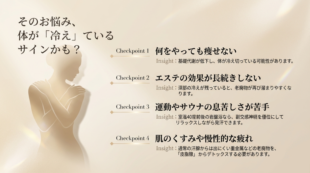 エステと岩盤浴を組み合わせることで、日頃の疲れをリセットしながら、より効率的なボディメイクを目指せる環境が整っています。