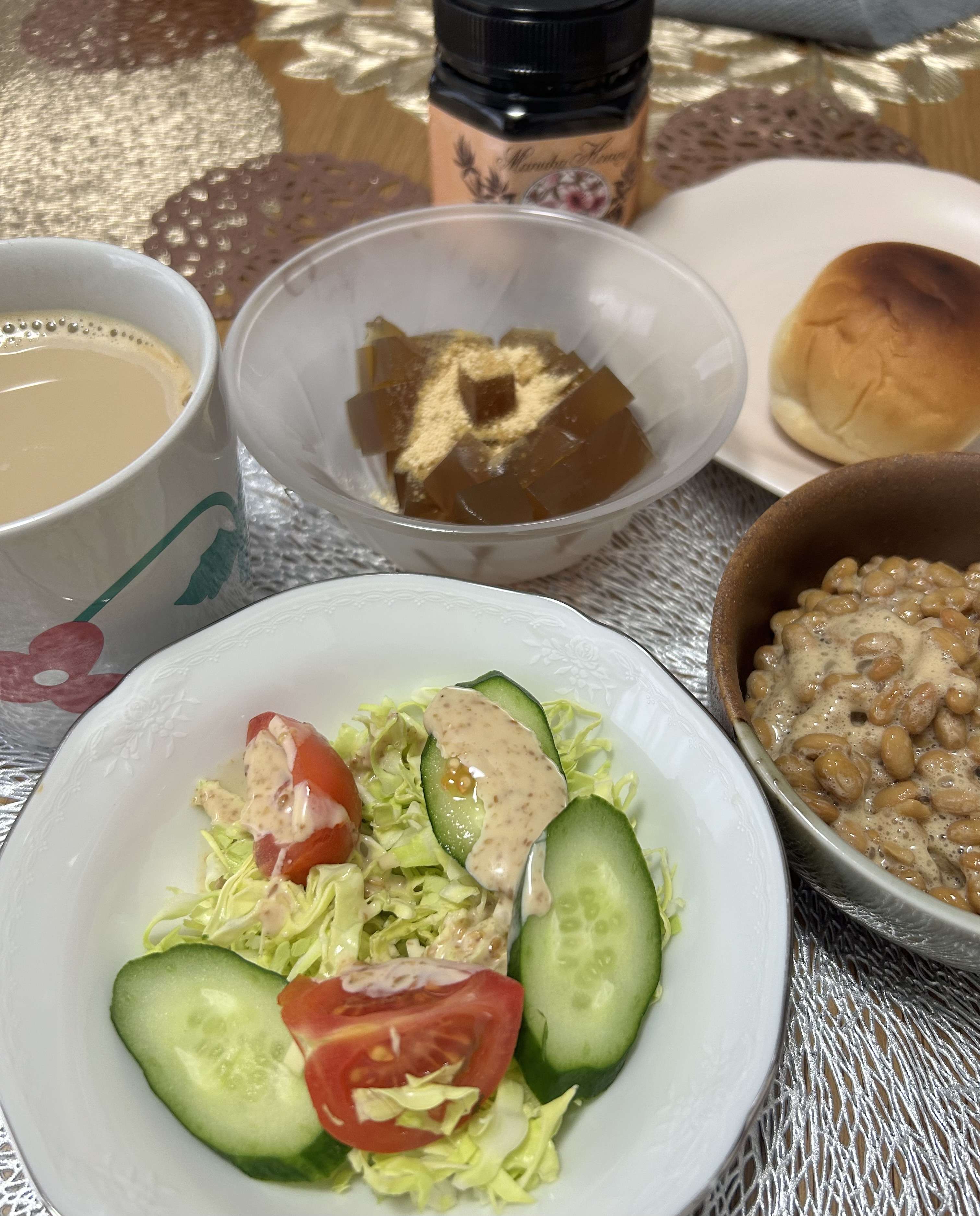 朝ごはんのメニューは、ほぼ毎日同じで納豆、豆腐、豆乳コーヒー、黒糖寒天&きな粉、パンです。