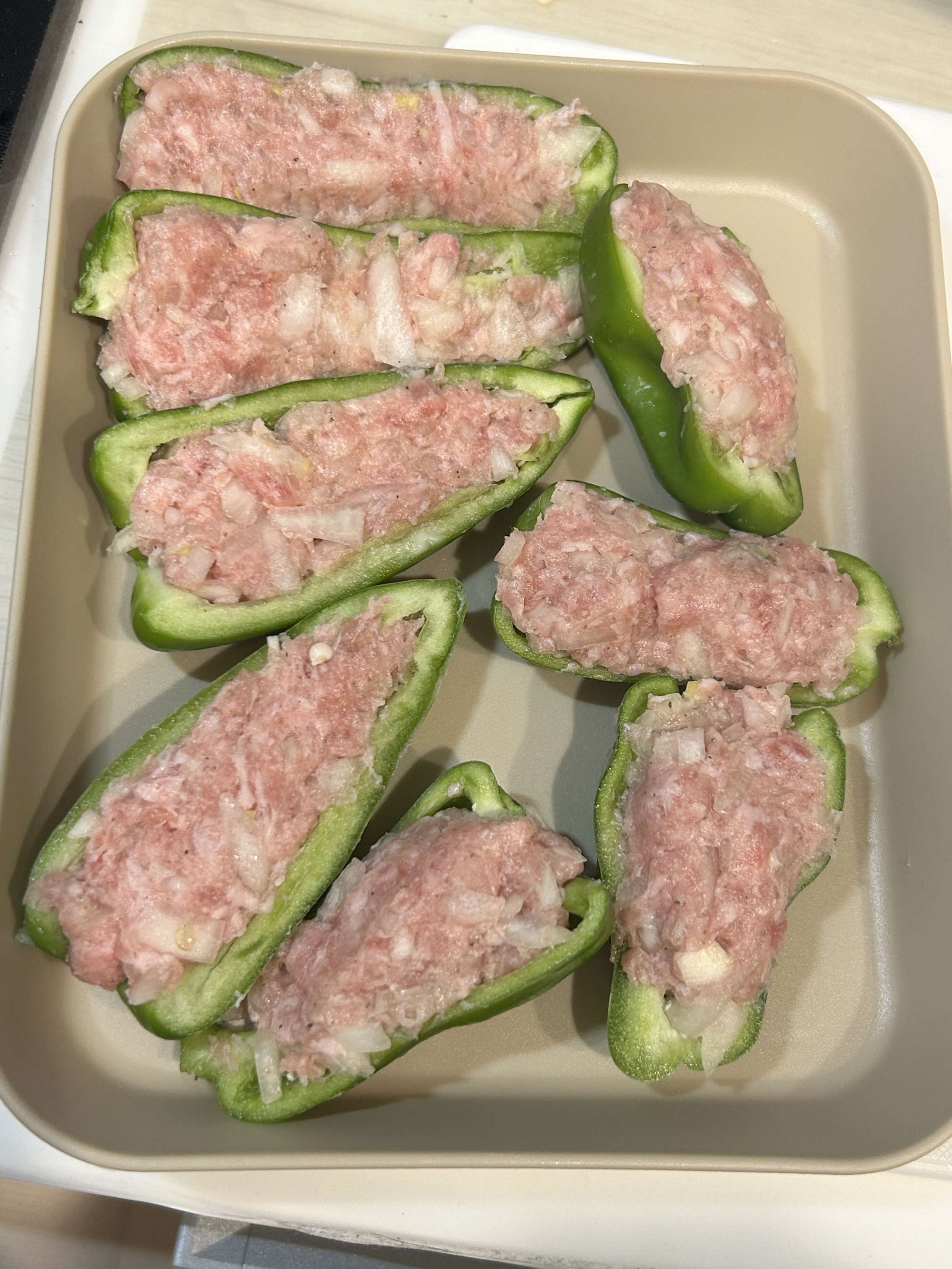 肉類でなかなか出番がなかったミンチの残りと、なんとなく買ったピーマンで、肉詰めができました。