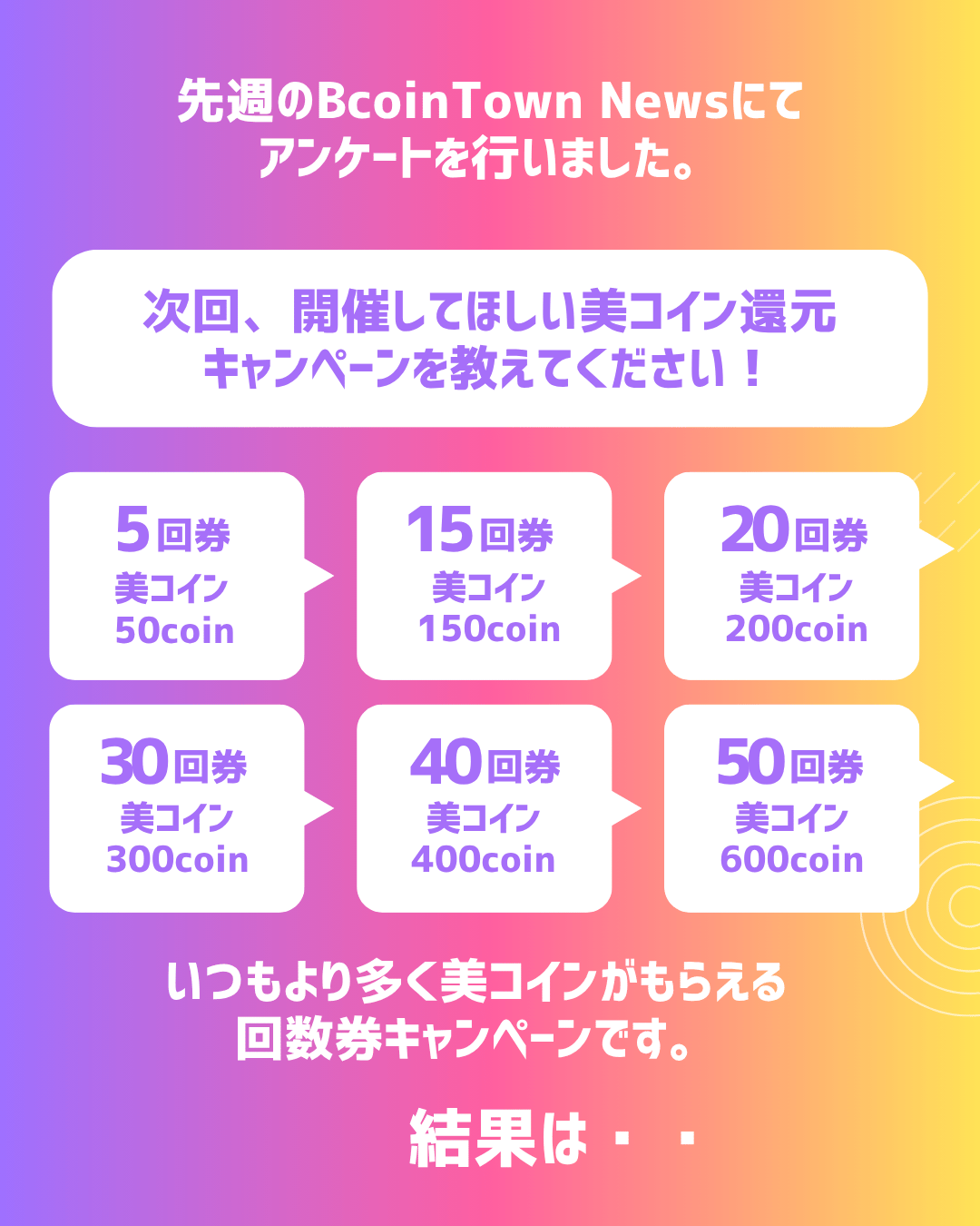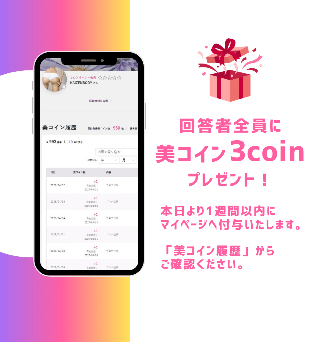 なお、アンケートにご回答いただいた皆さまには、1週間以内に回答特典として3coinをプレゼントさせていただきます!