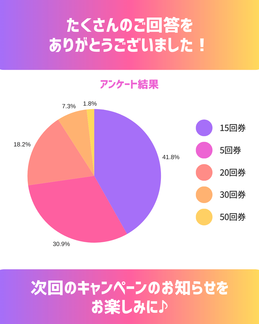 先日ご協力いただきました「次回キャンペーンに関するアンケート」につきまして、たくさんのご回答をお寄せいただき、心より御礼申し上げます。