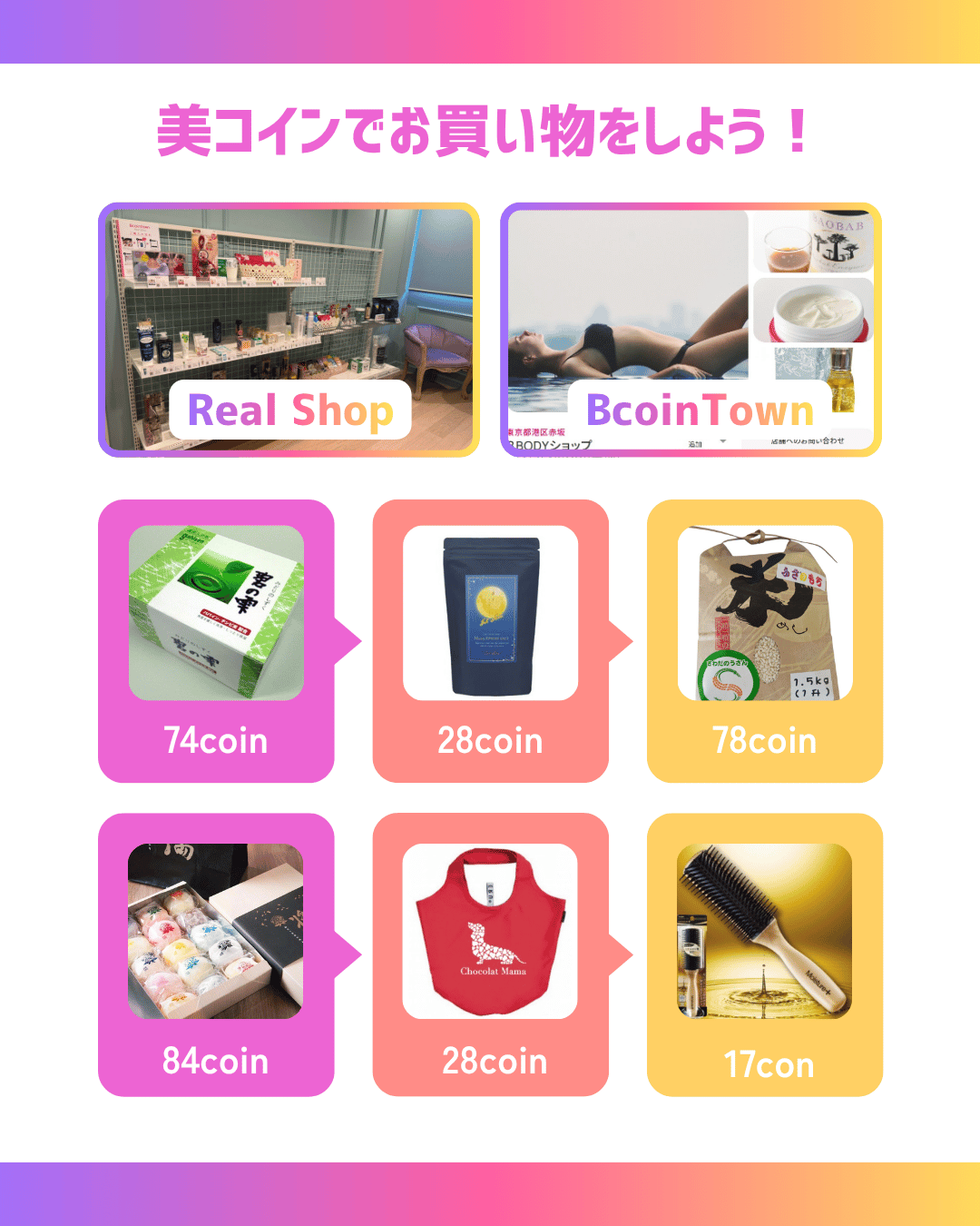 BcoinTown・Real Shopでのお買い物や、都度払いエステ券にご利用ください。