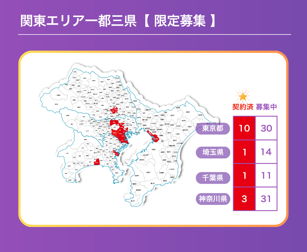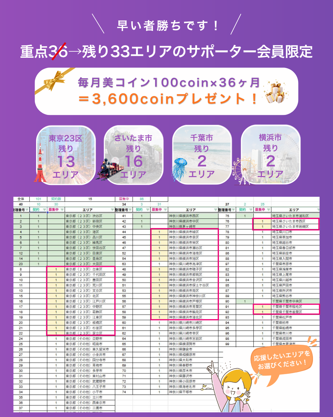 36エリア中、3エリアがご契約となり、残り33エリアです。